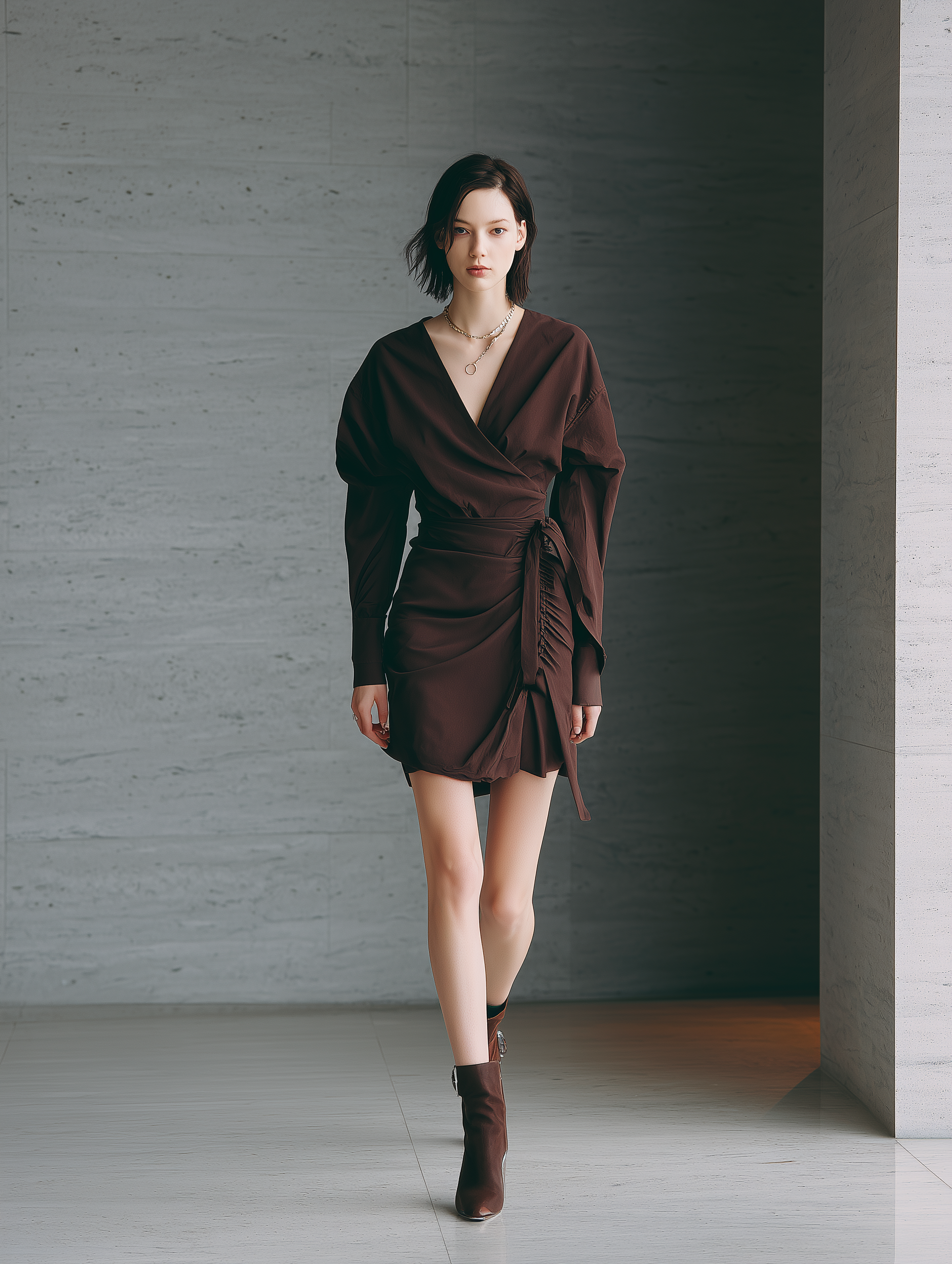 Women's Dark Brown Cotton Blend V-Neck Tie-Waist Mini Dress MDA0471K0T