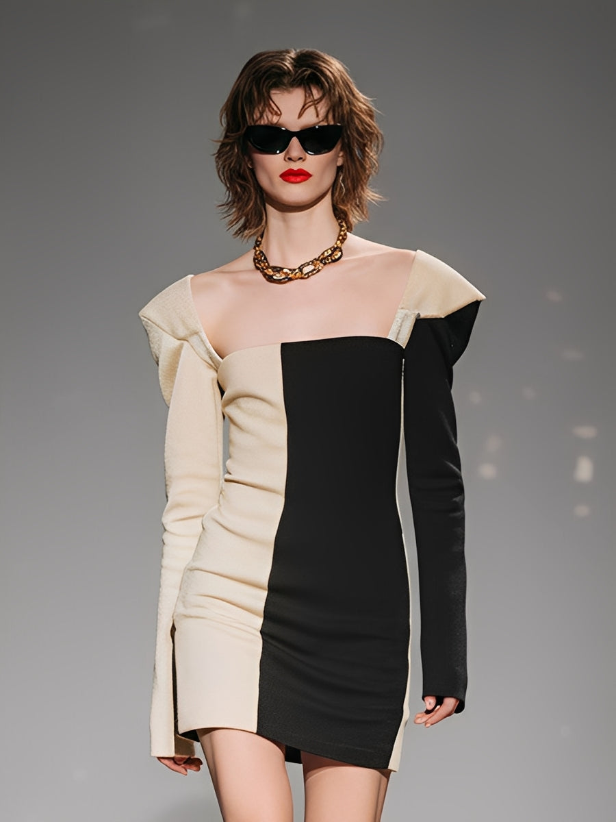 Women's Black & Ivory Knitted Mini Dress With Color-Block Silhouette & Structured Shoulders, Modern Statement Style Dress MDA0409K3I