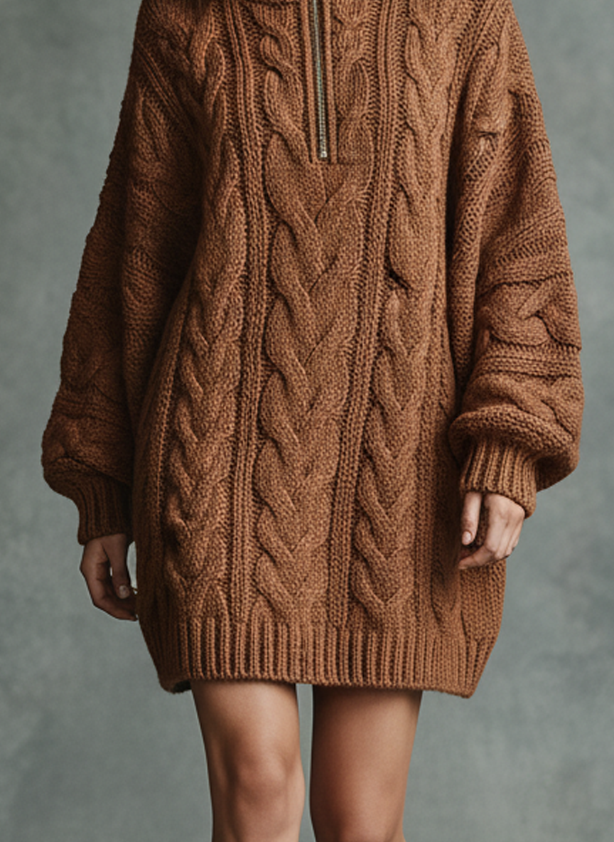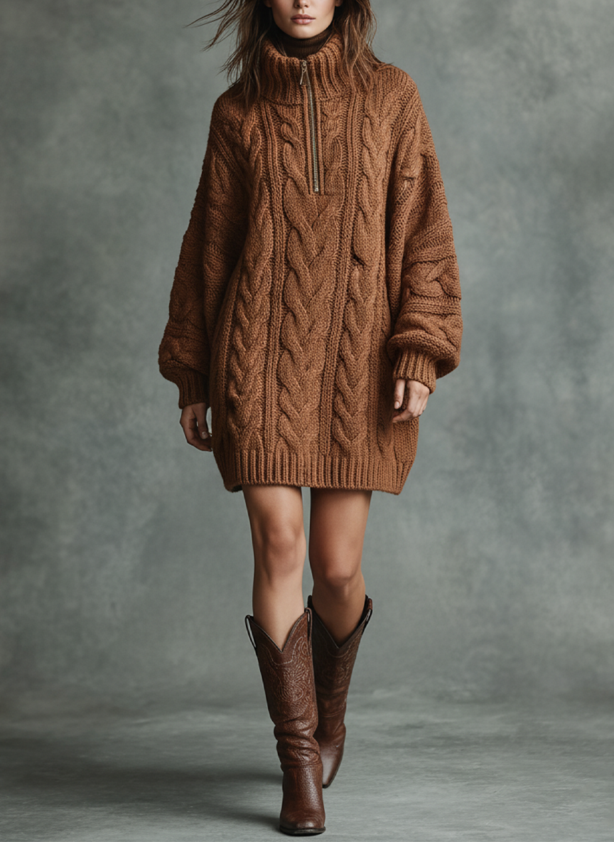 Women's Loose Cable Knit Zipper High Neck Mini Dress MDA2805J3Y