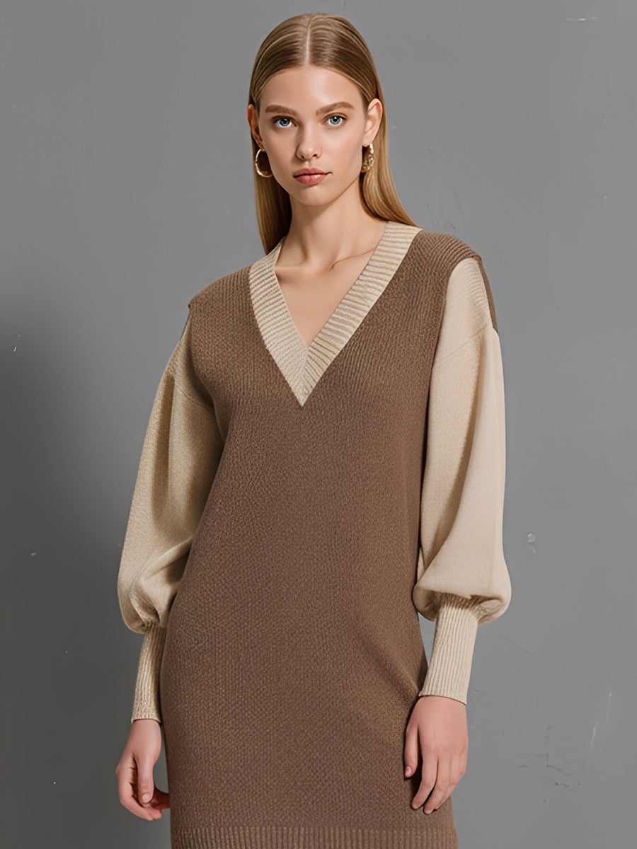 Women's Brown & Beige Knitted Casual-Chic Mini Dress With Contrast V-Neck & Puff Sleeves, Effortless Everyday Dress MDA2753J7I