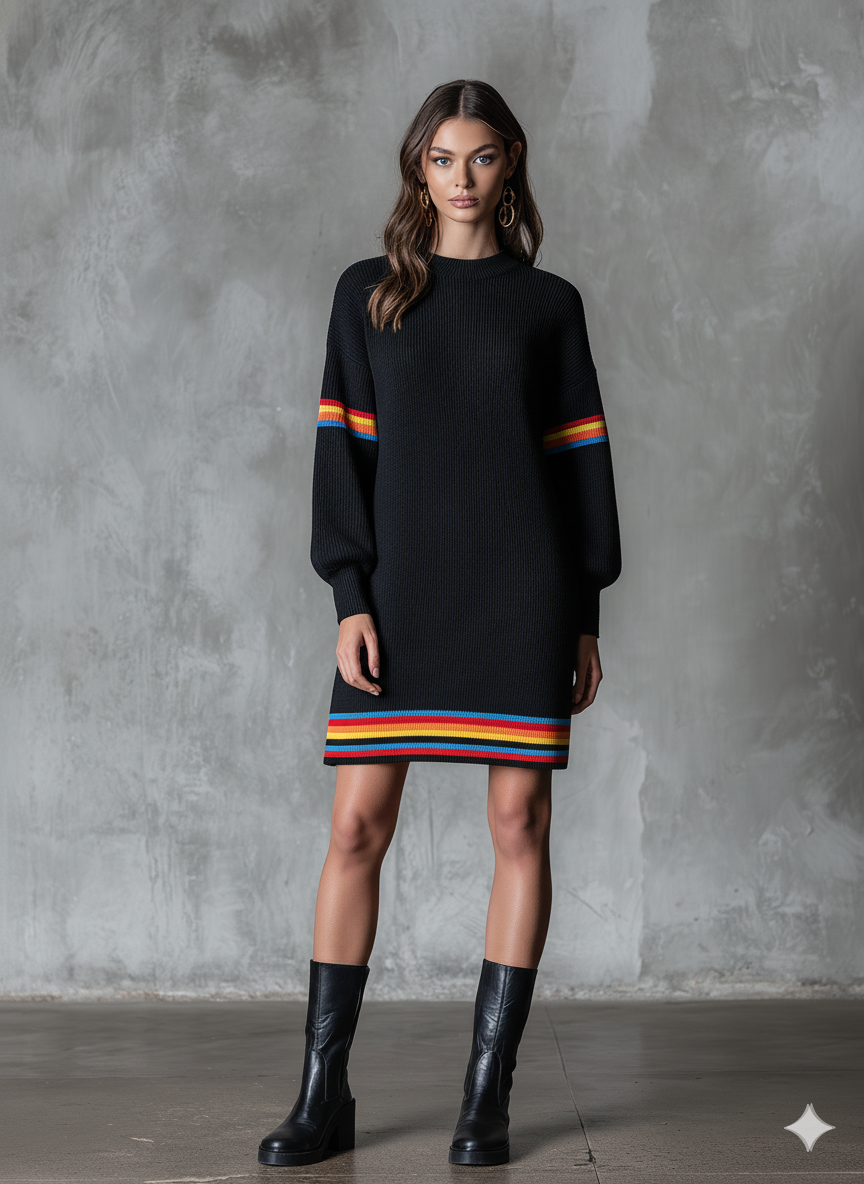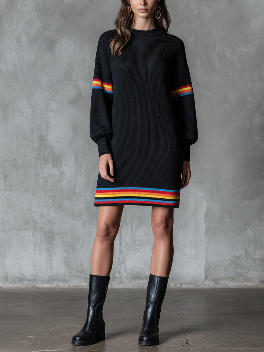 Women's Black Knit Rainbow Striped Loose Sweater Mini Dress MDA0135K8T