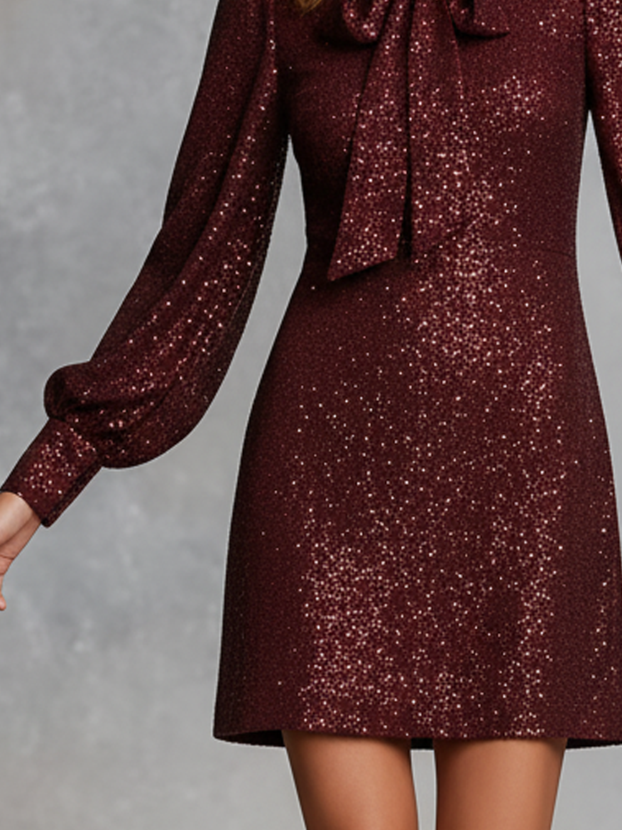 Women's Sequined High Neck Bow Tie Lantern Sleeve Party Mini Dress MDA3069J0Y