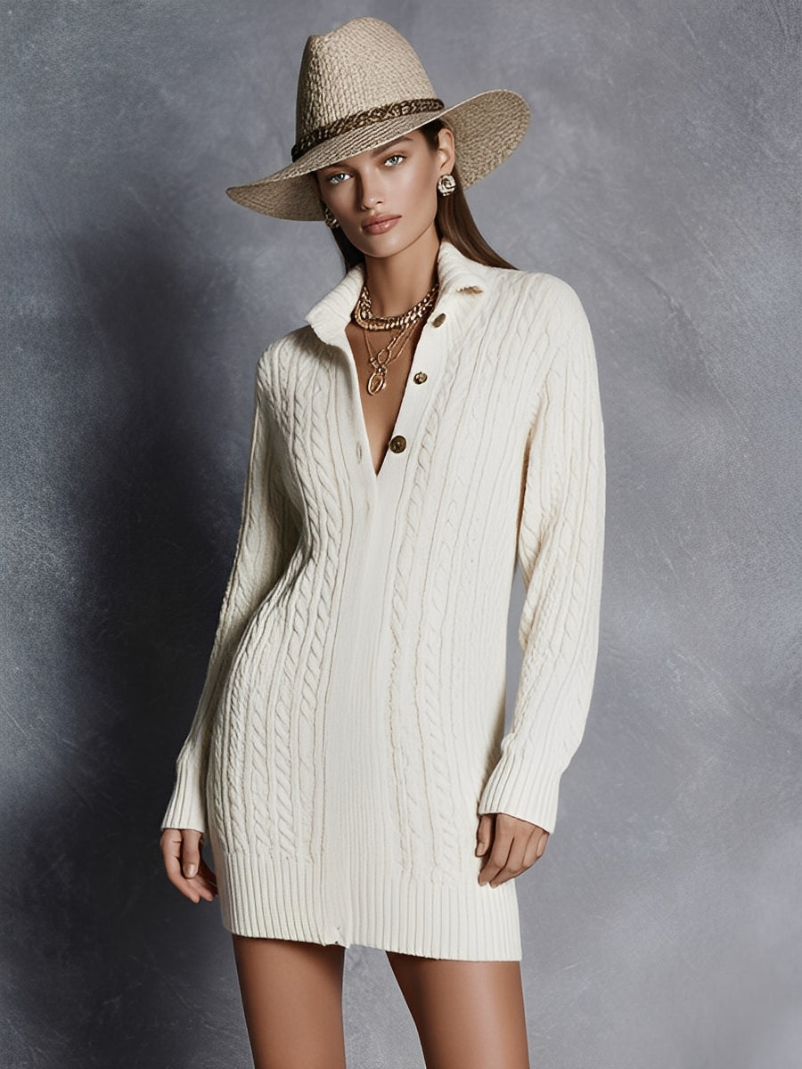 Women's Cream Cable-Knit Casual-Chic Mini Dress With Polo Collar & Button-Front, Retro Western Mini Dress MDA2912J9I