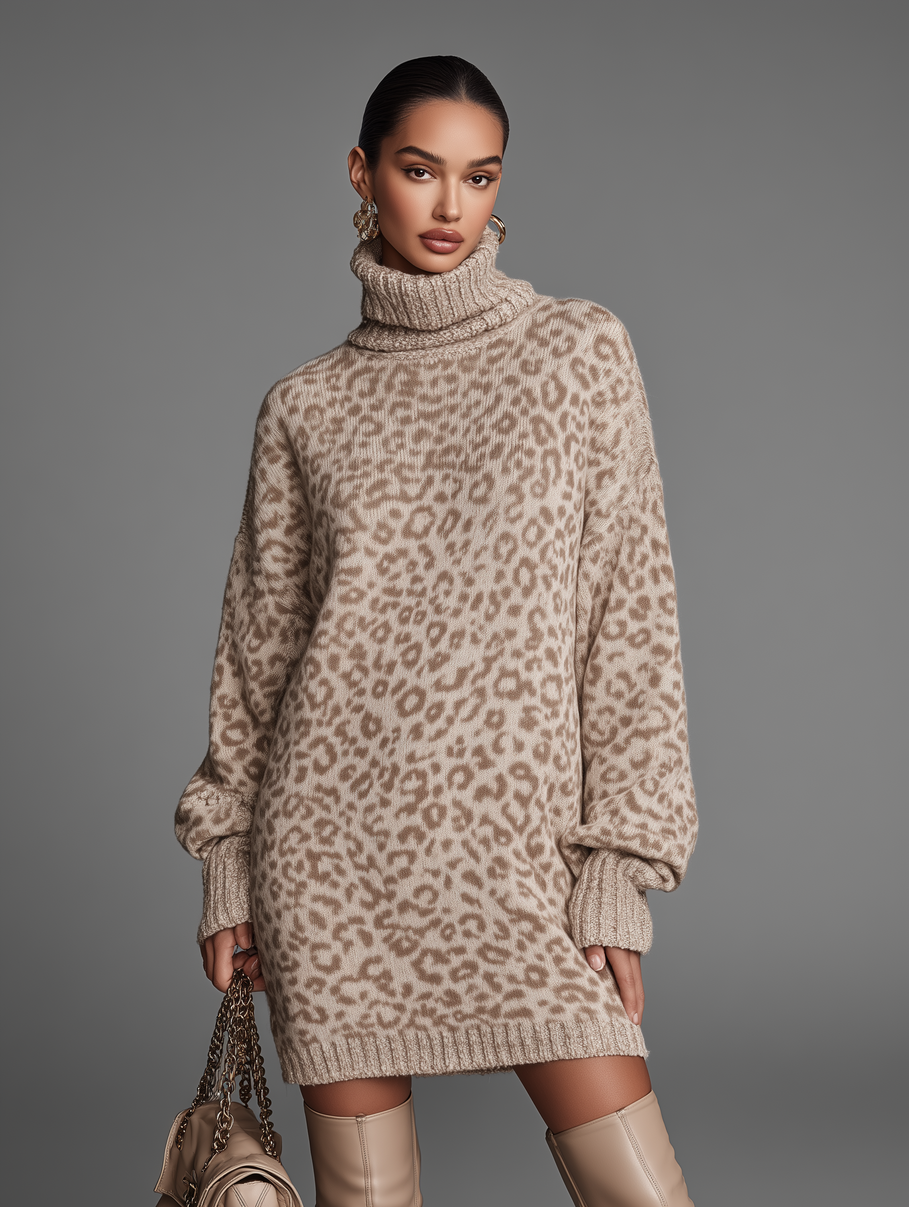 Women's Beige Leopard Print Knit Turtleneck Loose Sweater Mini Dress MDA0122K3T