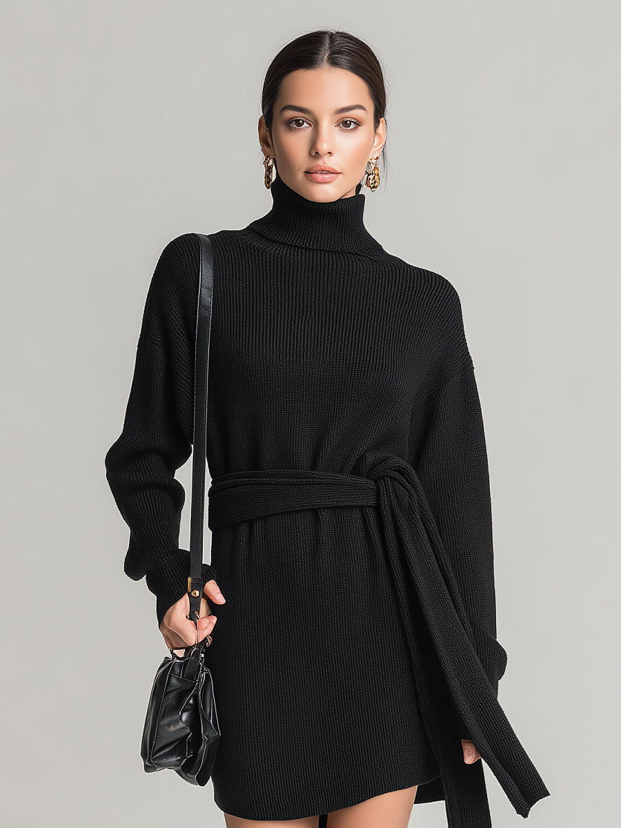 Women's Black Rib-Knit Chic Turtleneck Tie-Waist Sweater Dress MDA0114K4I