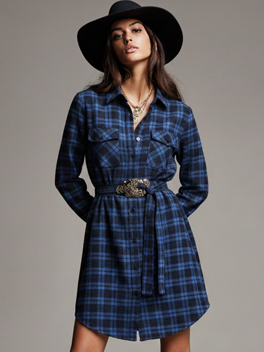 Women's Blue Cotton Blend Plaid Western Style Belted Shirt Dress (Without Belt) MDA3117J6I