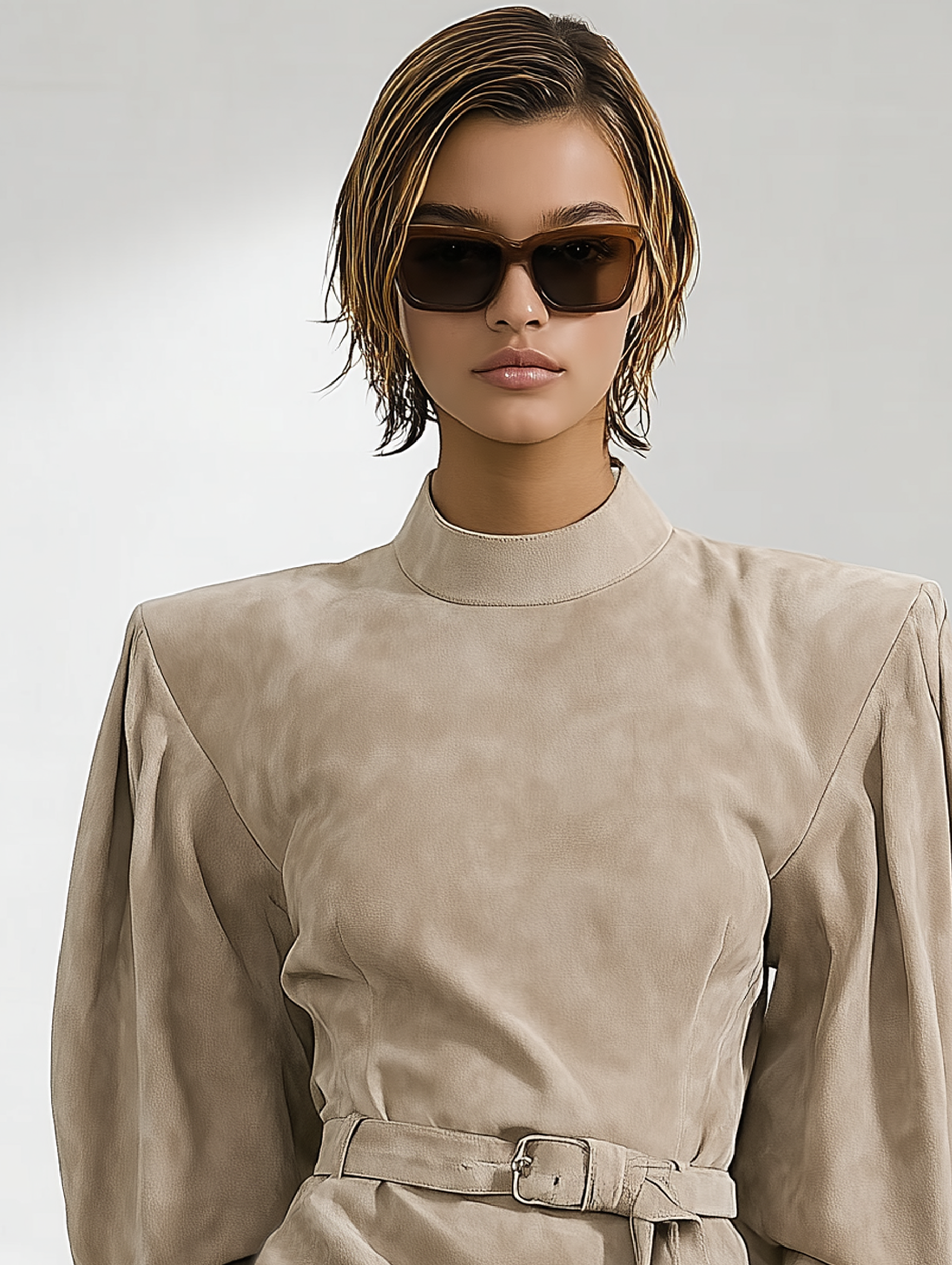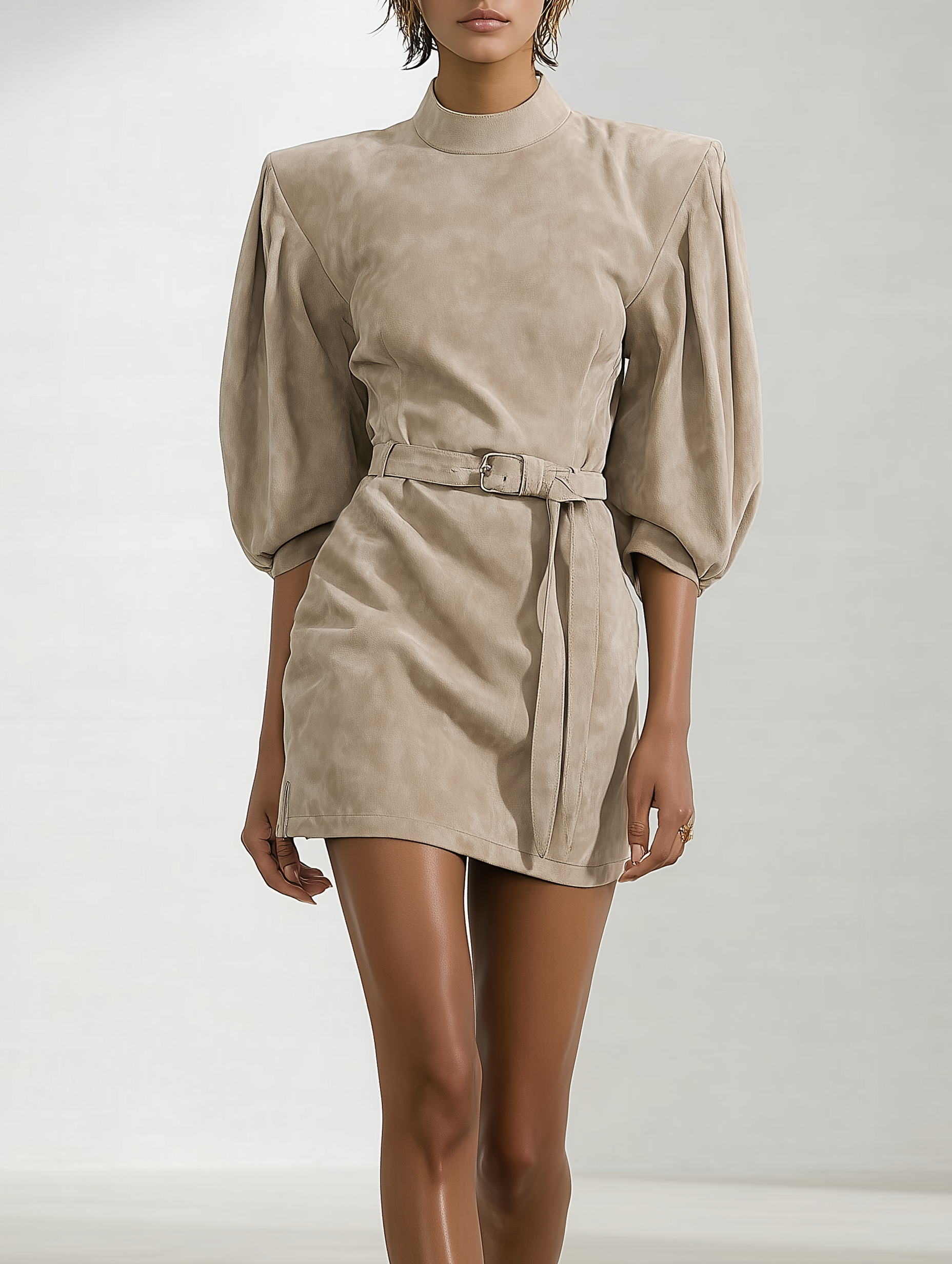 Women's Minimalist Faux Suede Padded Shoulder Belted Mini Dress MDA3051K9Y