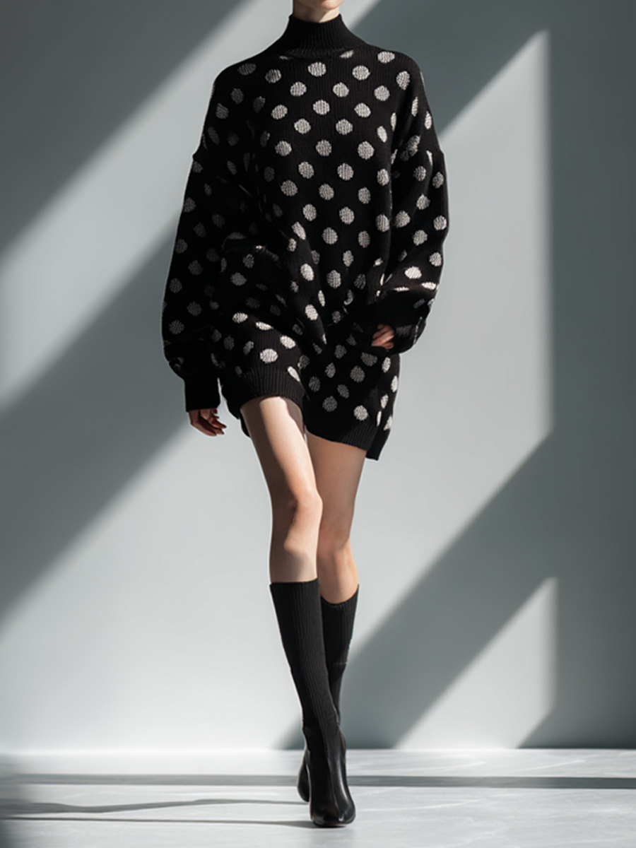 Women's Oversized Polka Dot Turtleneck Knit Mini Dress MDA2836K5AP