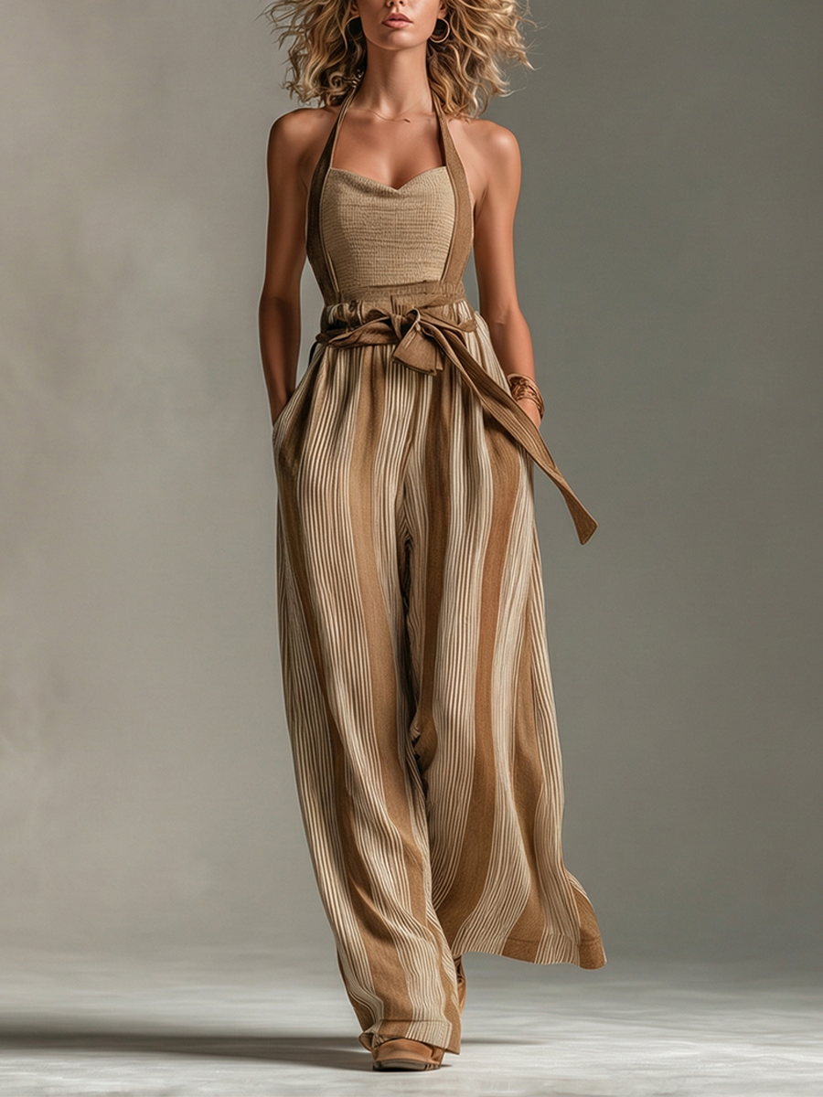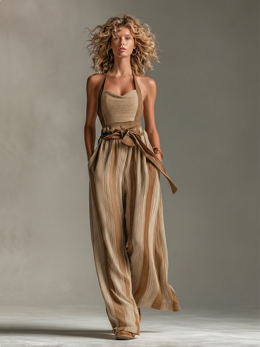 Women's Brown Striped Jumpsuit With Halter Neck & Wide-Leg Trousers, Modern Casual-Elegant Style Jumpsuit MDZ2878B3I