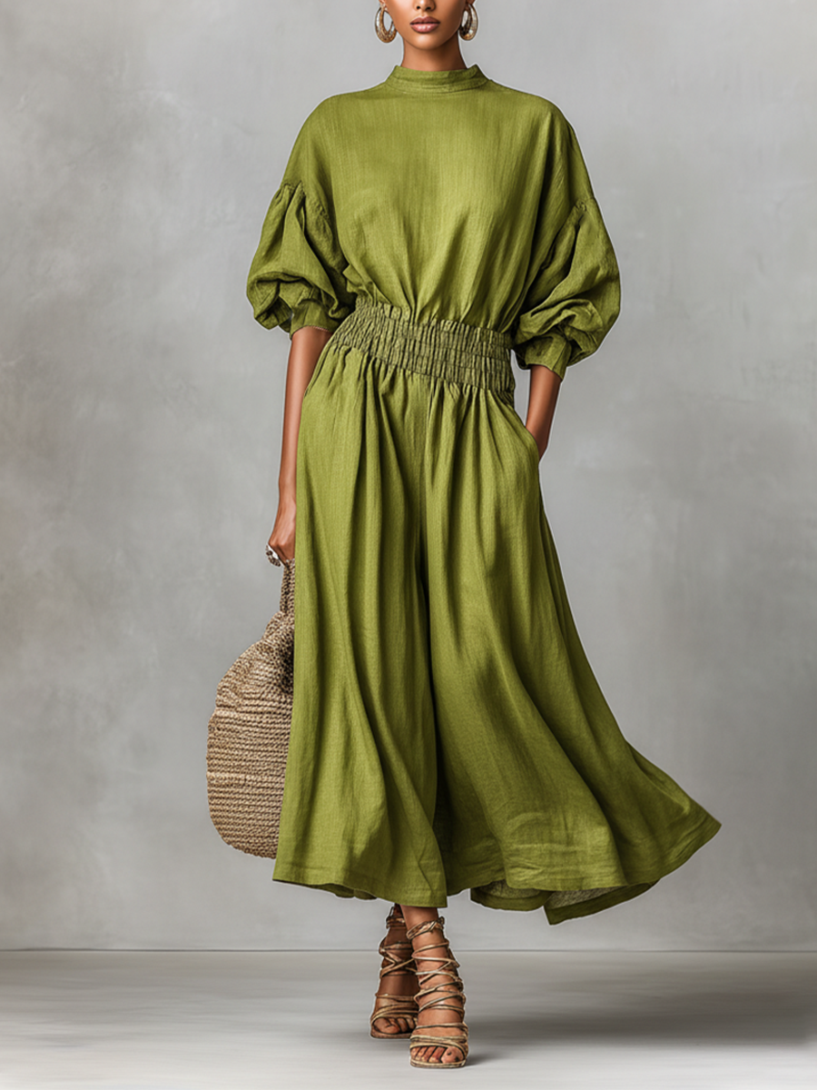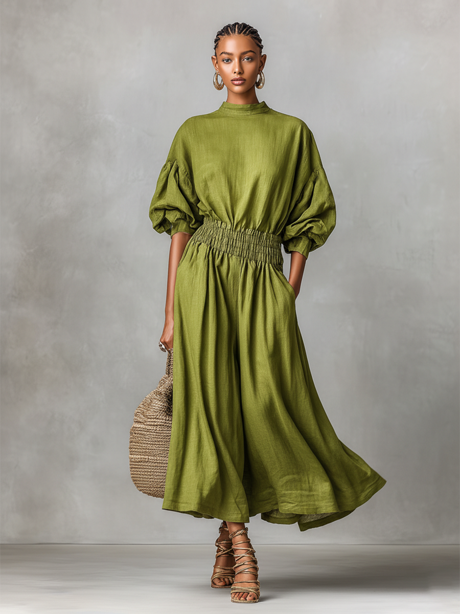 Women's Green Linen Dress With High Neck & Ruched Waist, Timeless Minimalist-Elegant Style Dress MDZ2830B5I