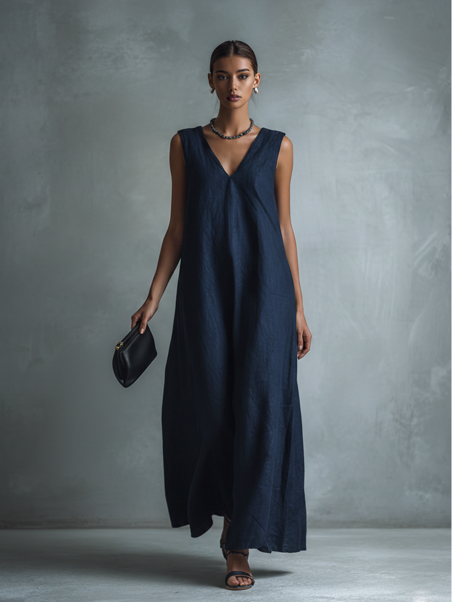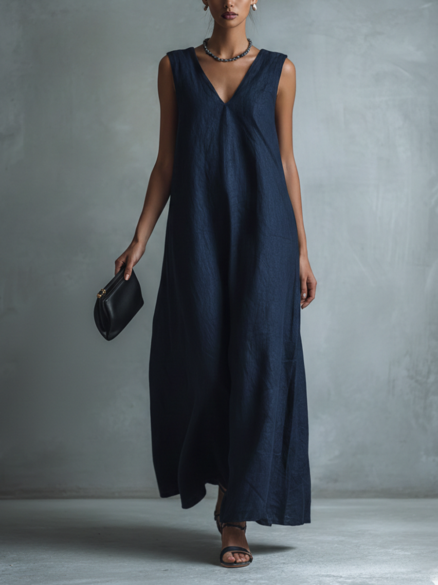 Women's Navy Blue Sleeveless Deep V-Neck Maxi Dress MDZ2816B6BA