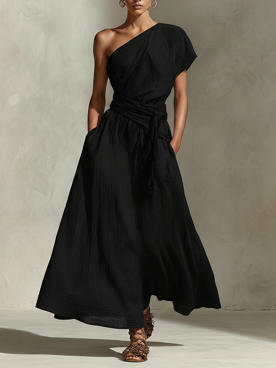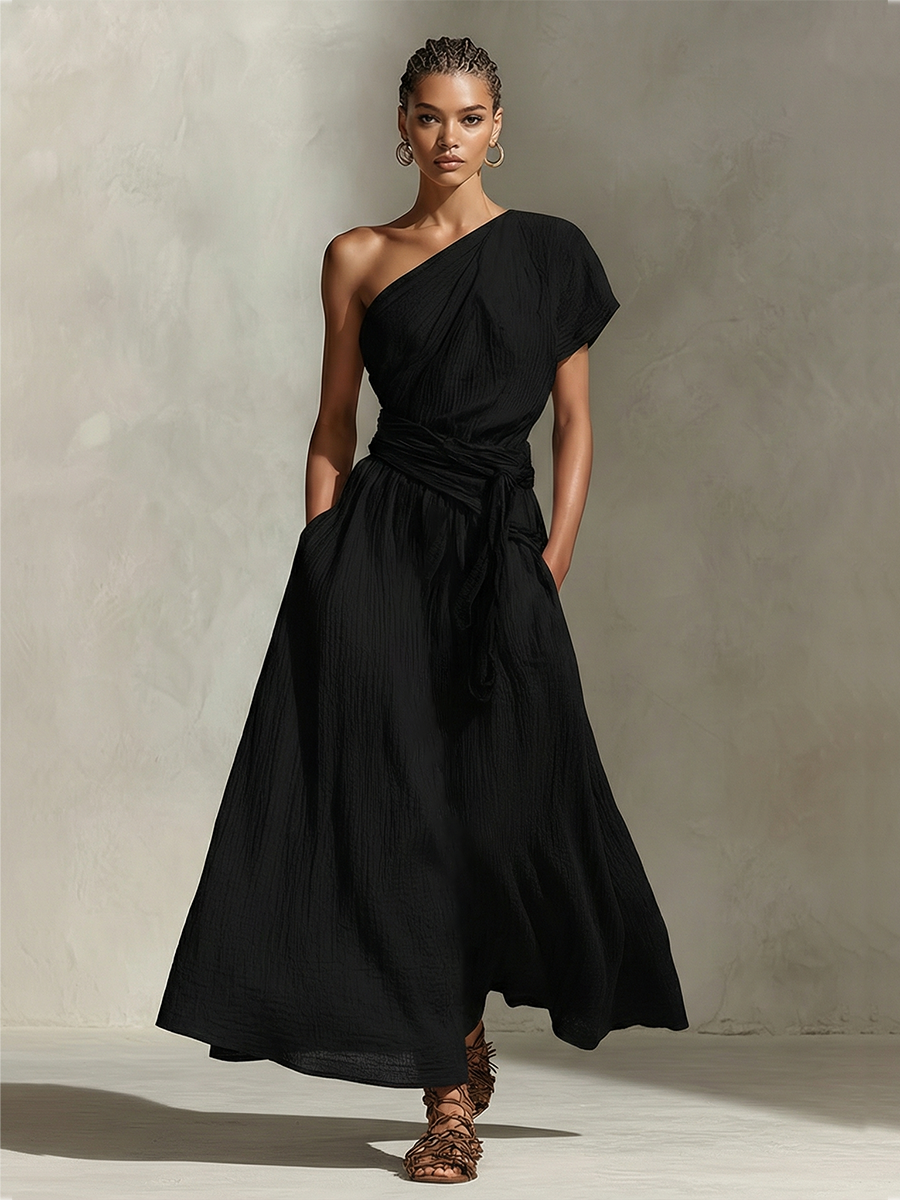 Women's Black Textured Dress With One-Shoulder Neckline & Belted Waist, Timeless Minimalist-Elegant Style Dress MDZ2876B0I