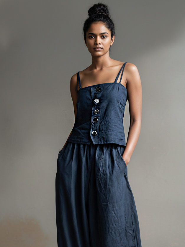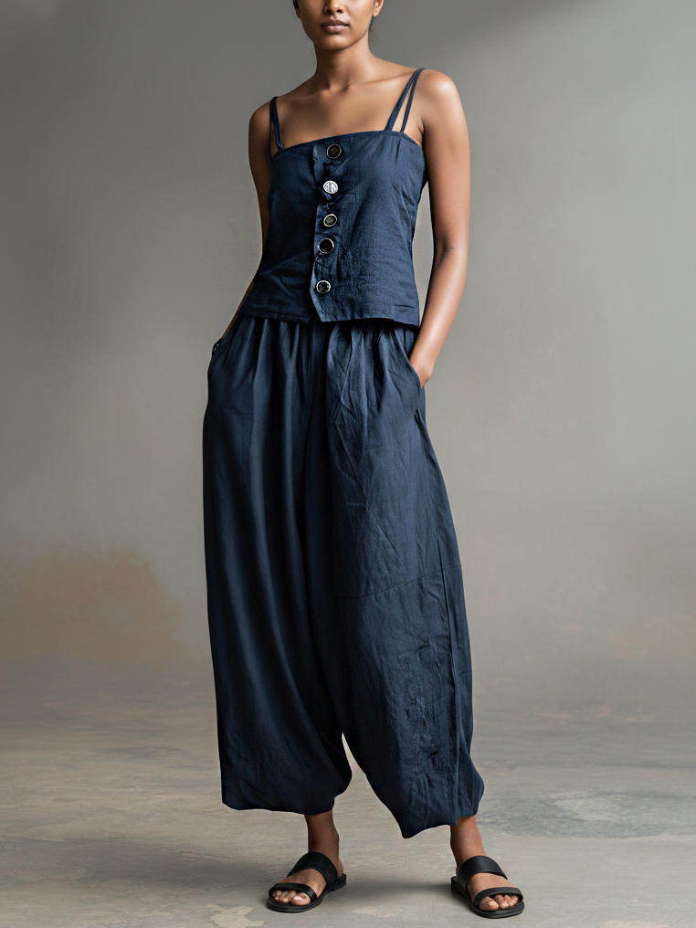 Women's Casual Dark Blue Cotton Linen Sleeveless Camisole Top Paired With Trousers Set MDZ2816B1AN