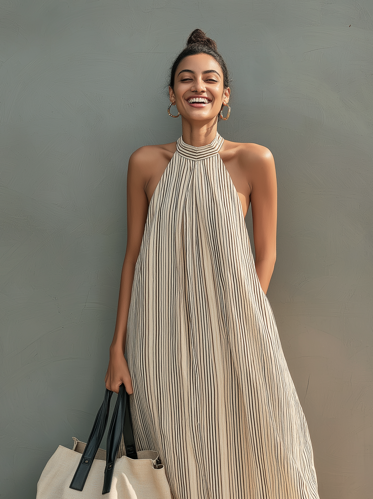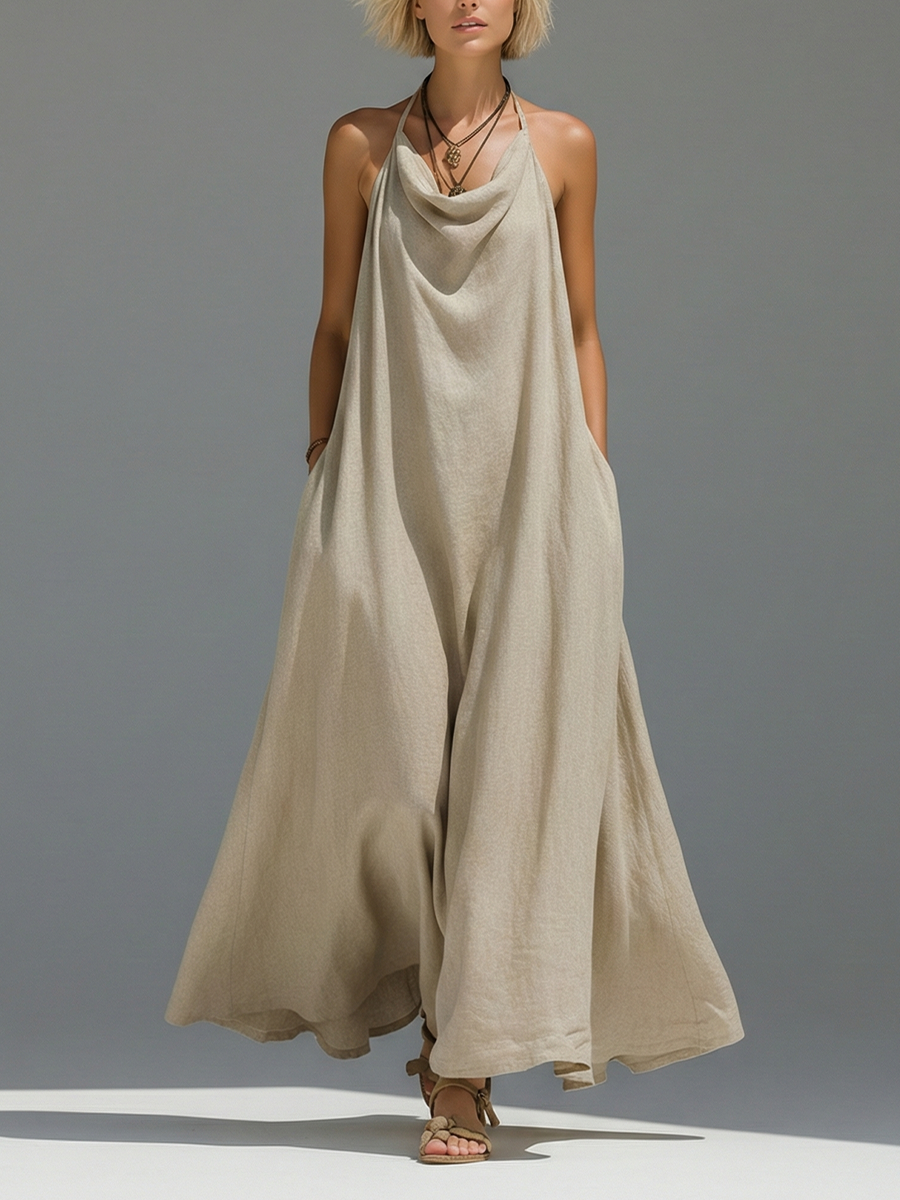 Women's Beige Linen Dress With Halter Neck & Cowl Bodice, Timeless Minimalist-Elegant Style Dress MDZ2812B4I