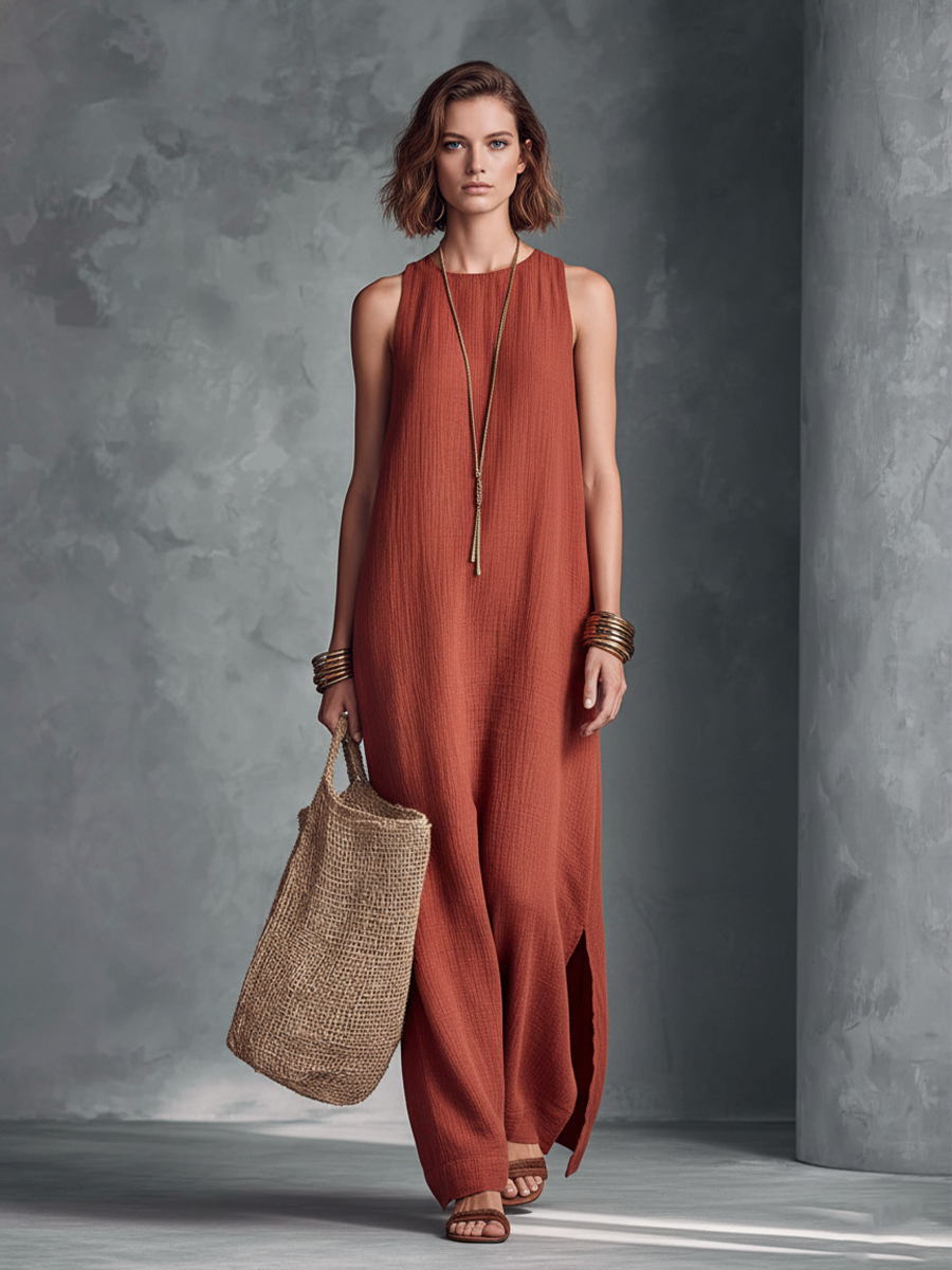 Women's Rust Orange Sleeveless Round Neck Maxi Dress With Side Slits MDZ2814B2BA