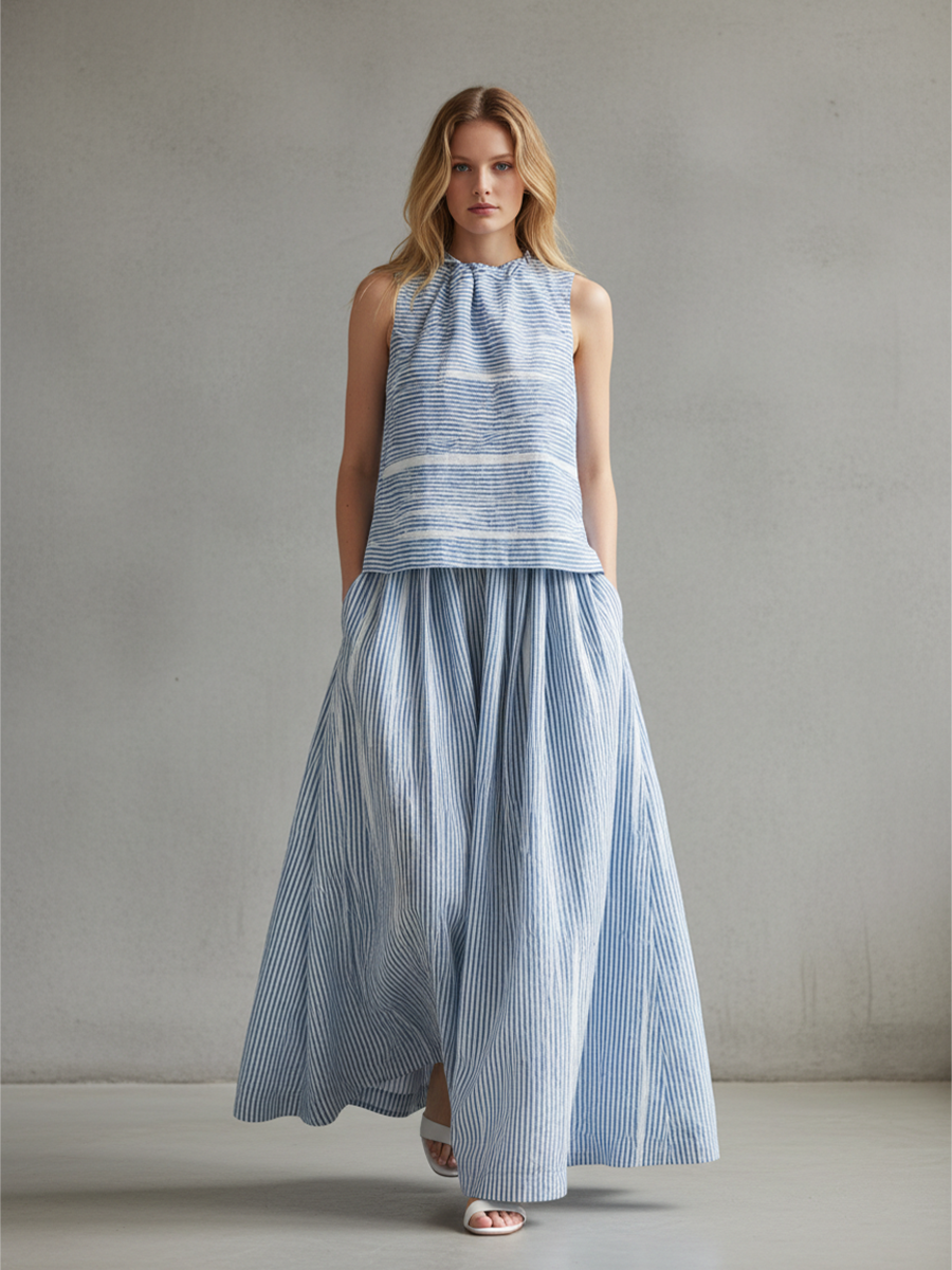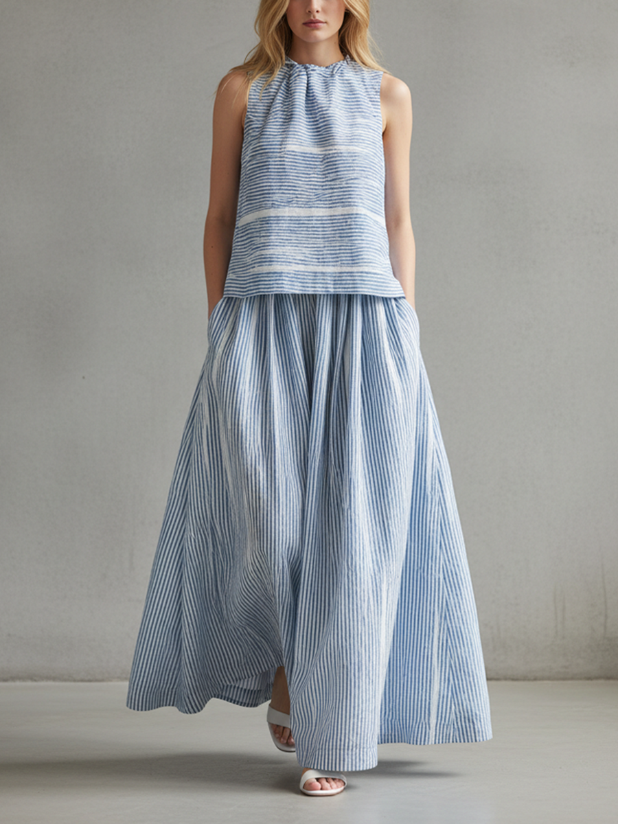 Women's Blue Striped Sleeveless Top And Maxi Skirt Set MDZ2873B6BA