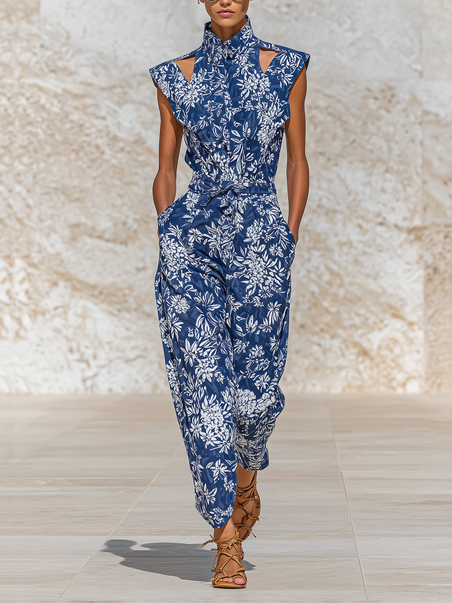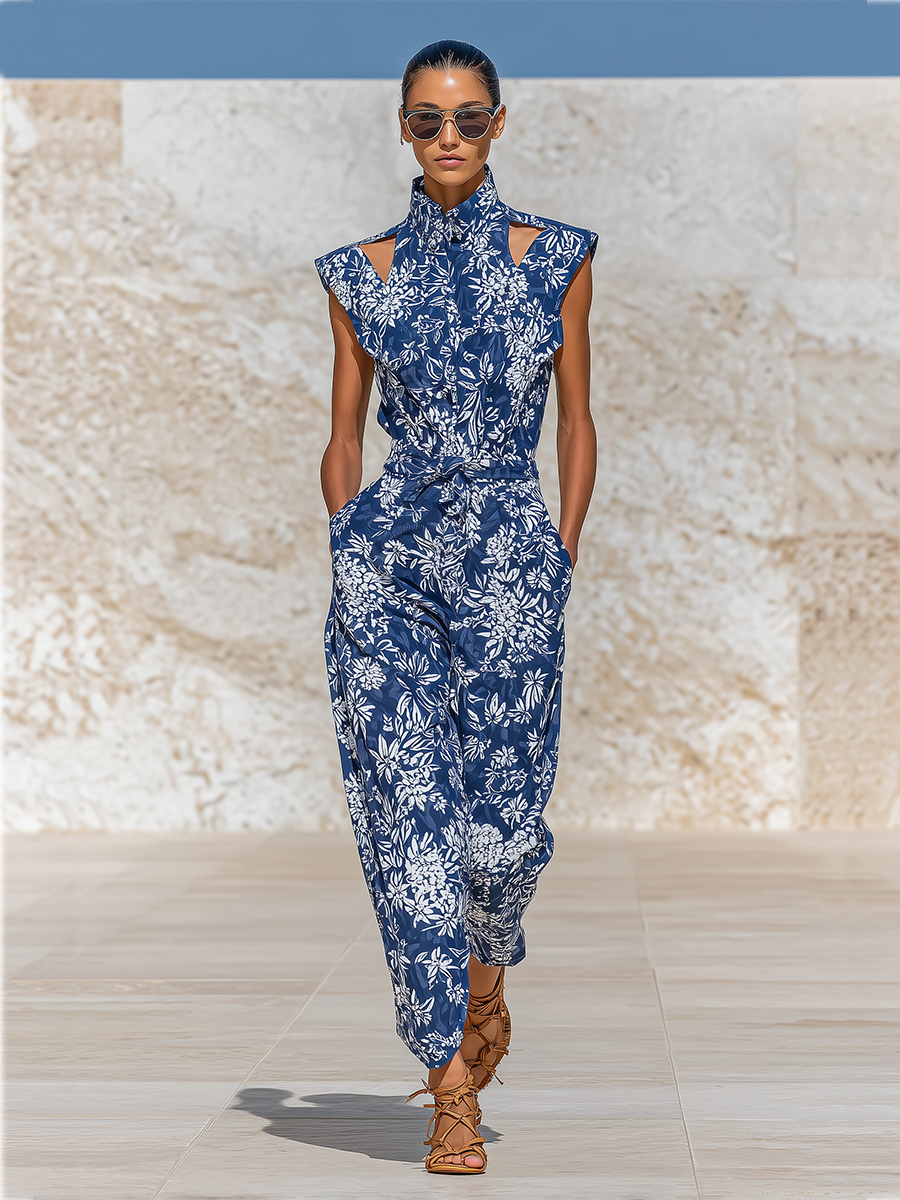 Women's Navy Blue Floral Print Jumpsuit With Cut-Out Shoulders & Belted Waist, Timeless Resort-Elegant Style Jumpsuit MDZ2817B1I