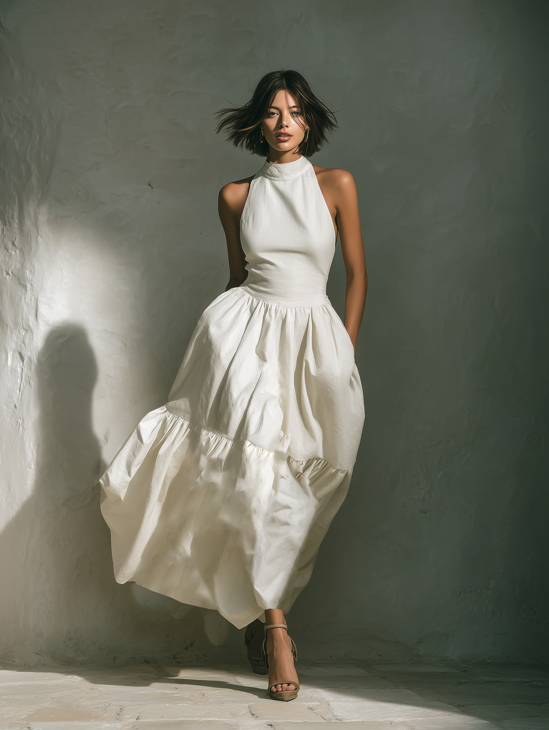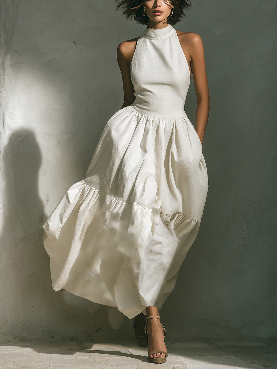 Women's White Halter Neck Maxi Dress With Tiered Ruffle Skirt & Side Pockets MDZ2710B2T
