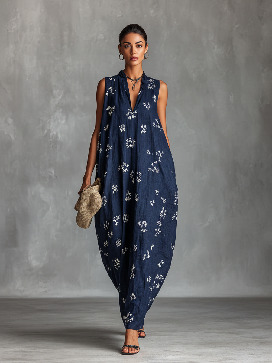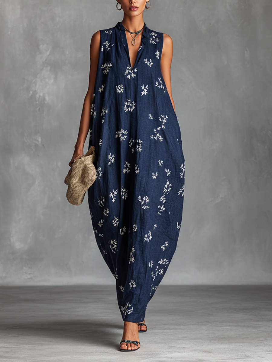 Women's Navy Blue Floral Print Sleeveless V-Neck Maxi Dress MDZ2846B2BA