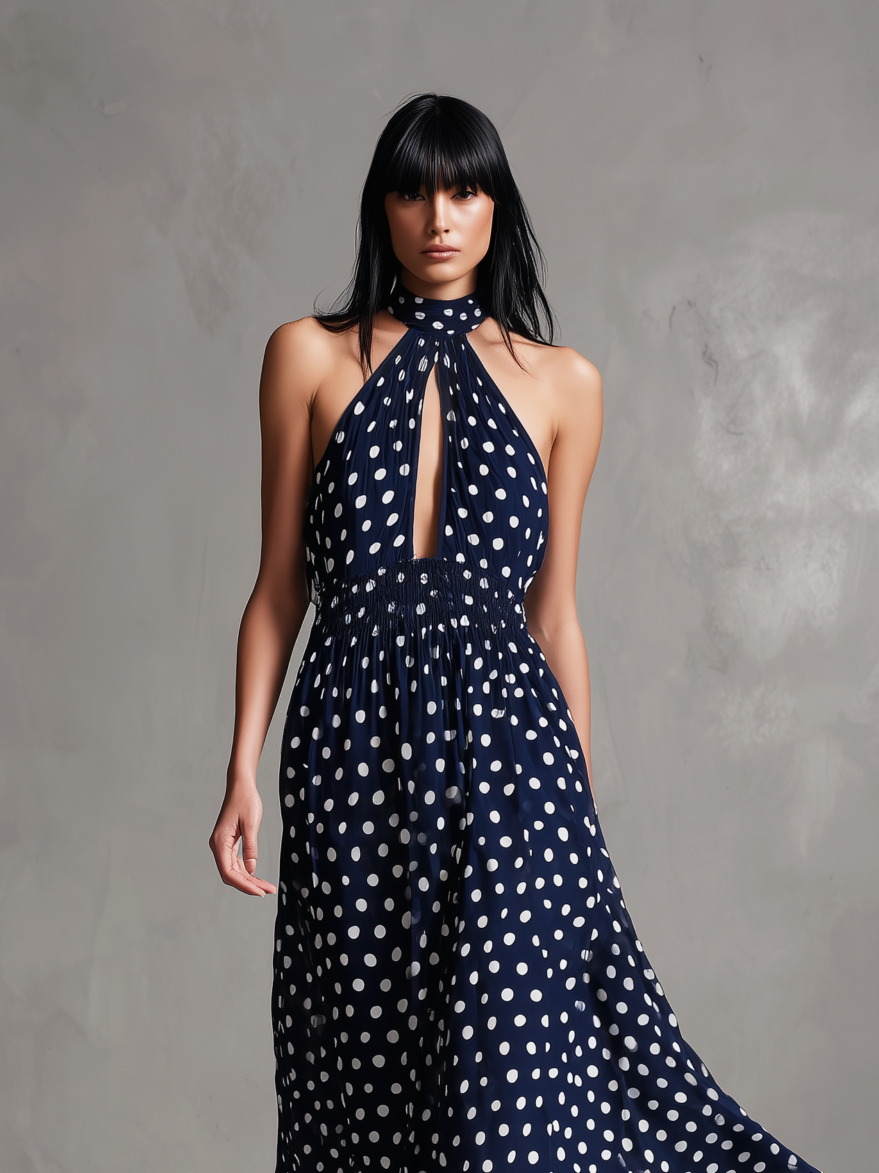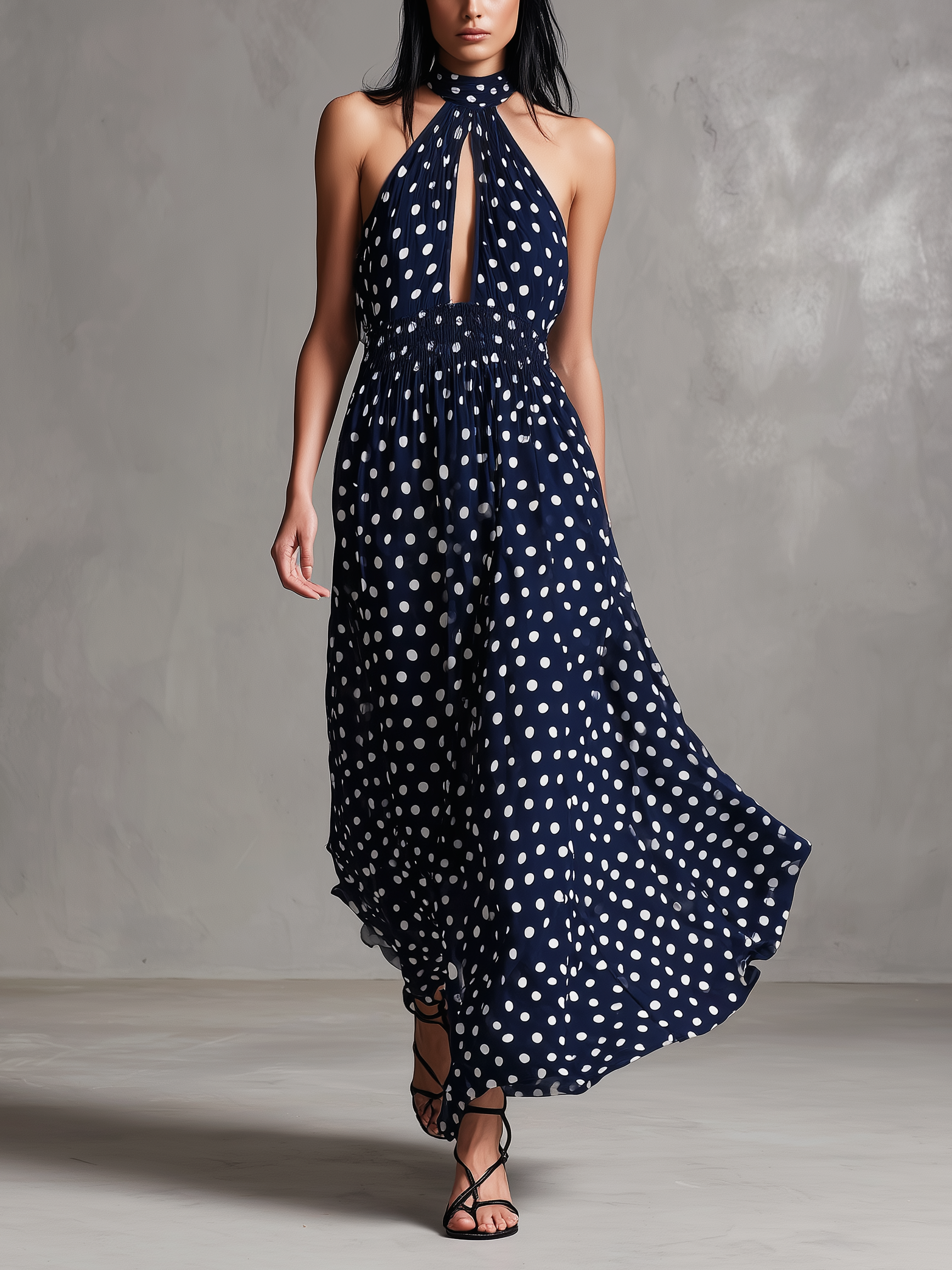 Women's Elegant Dark Blue Chiffon Halter Neck Sleeveless Long Dress MDZ2809B9AN