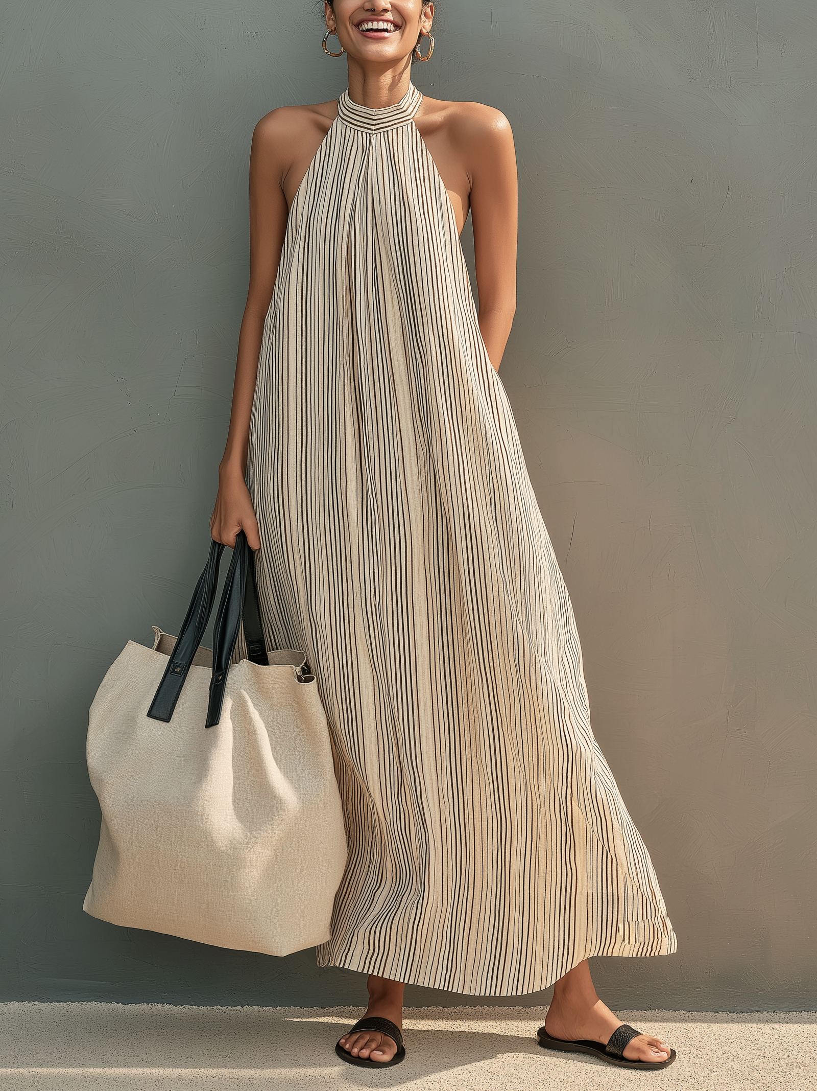 Women's Casual Beige Striped Woven Round Neck Sleeveless Loose-fitting Long Dress MDZ2850B7AN