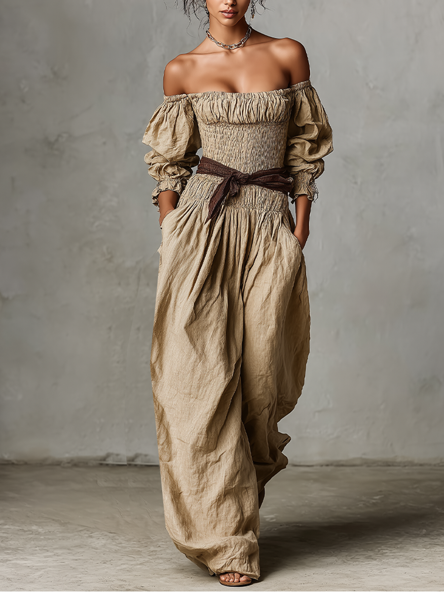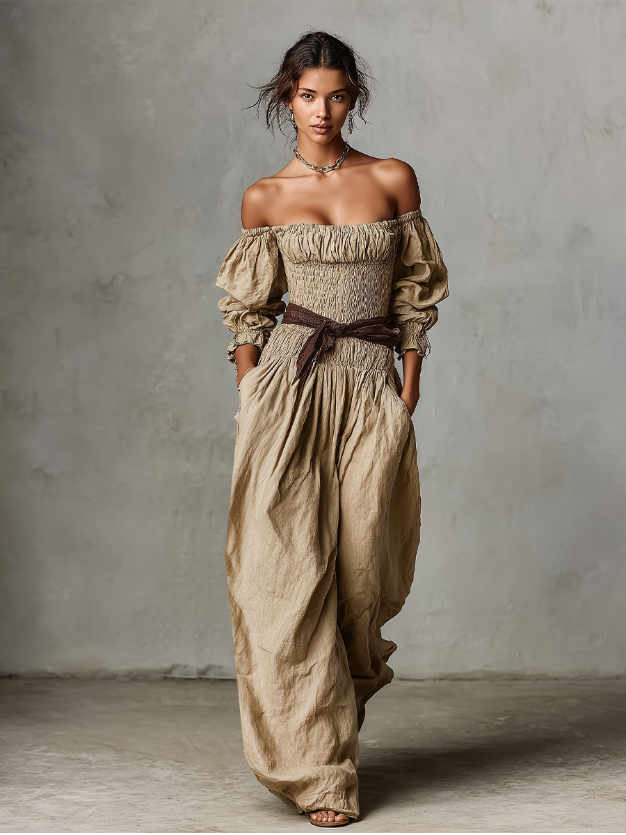 Women's Beige Linen Jumpsuit With Off-Shoulder Neckline & Ruched Bodice, Timeless Boho-Chic Style Jumpsuit MDZ2836B6I