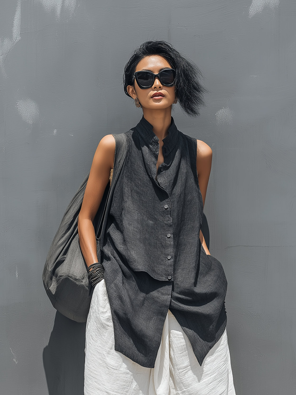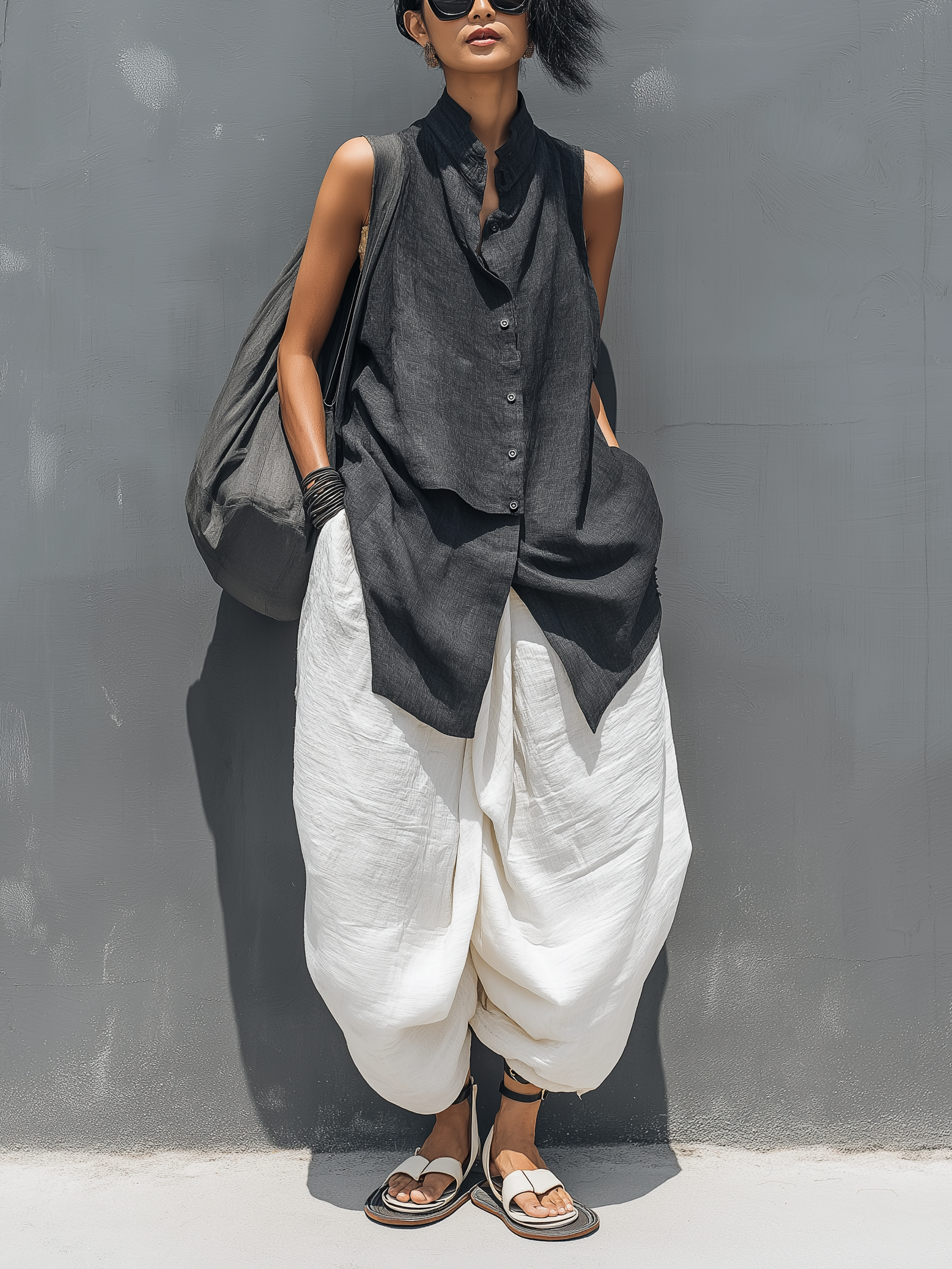 Women's Casual Dark Gray Cotton-linen Sleeveless Top Paired With White Cotton-linen Trousers Set MDZ2809B7AN