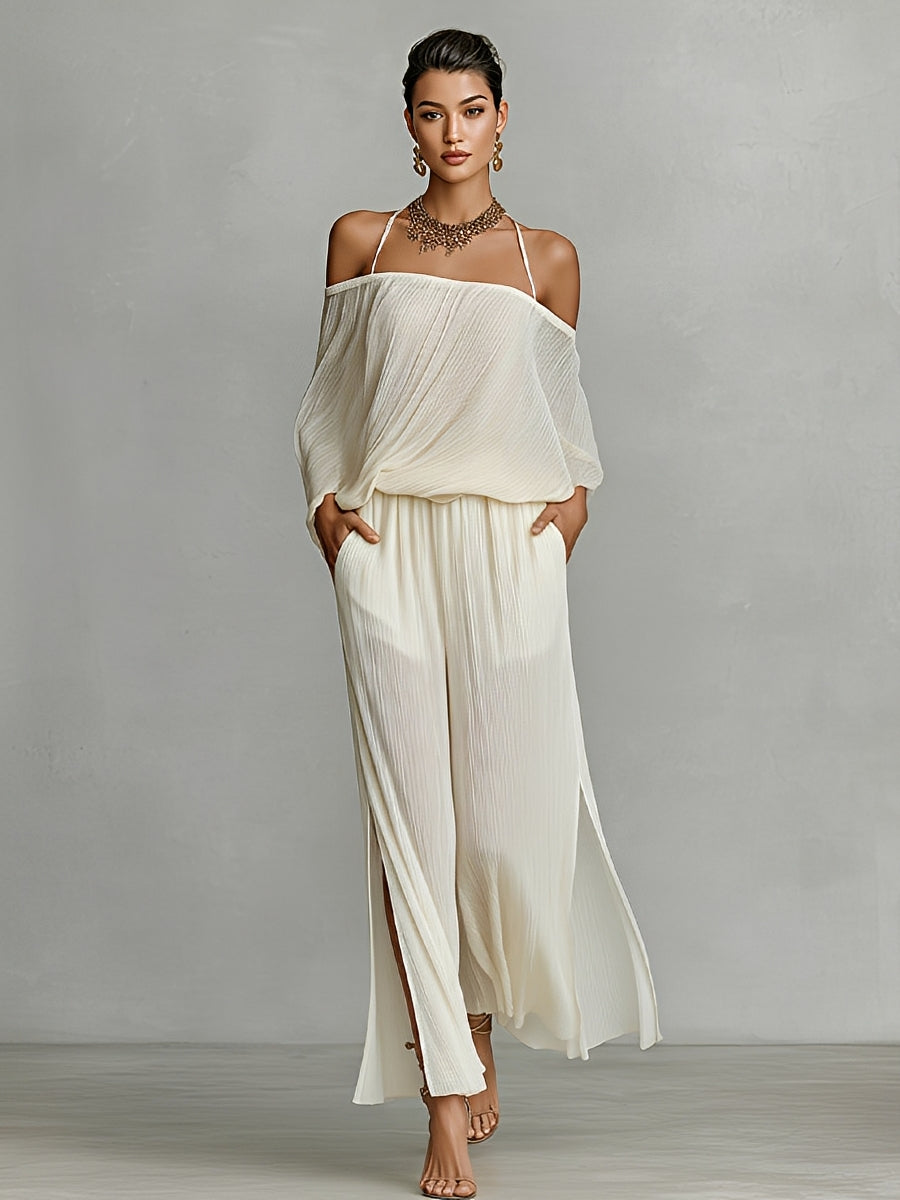 Women's Ivory Pleated Chiffon Set With Off-Shoulder Top & Split Wide-Leg Pants, Timeless Elegant-Chic Style Set MDZ2803B4I
