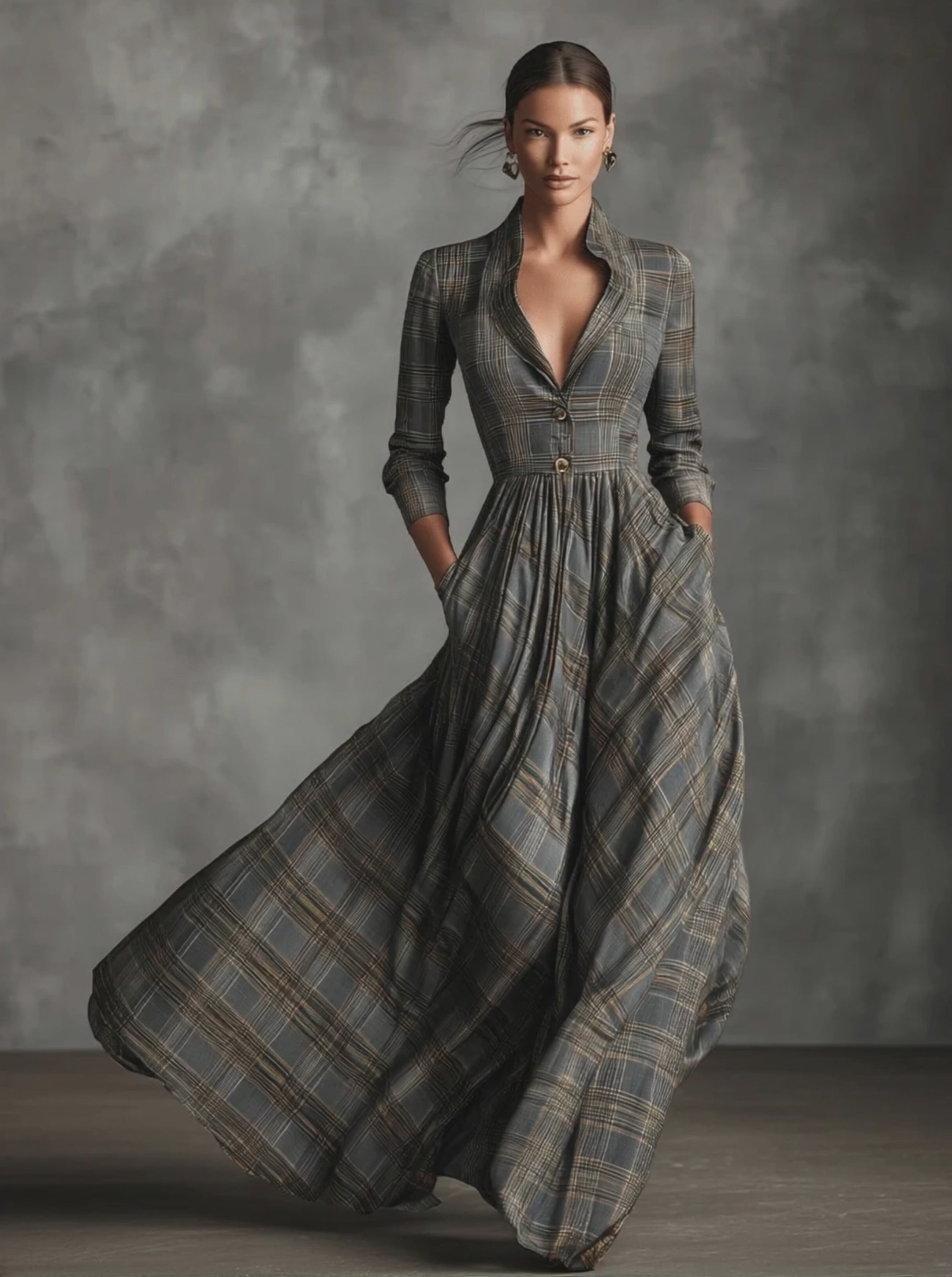 Women's Grey Sophisticated Tartan - Patterned Linen - Blend Flared Maxi Dress MDA0222I7I