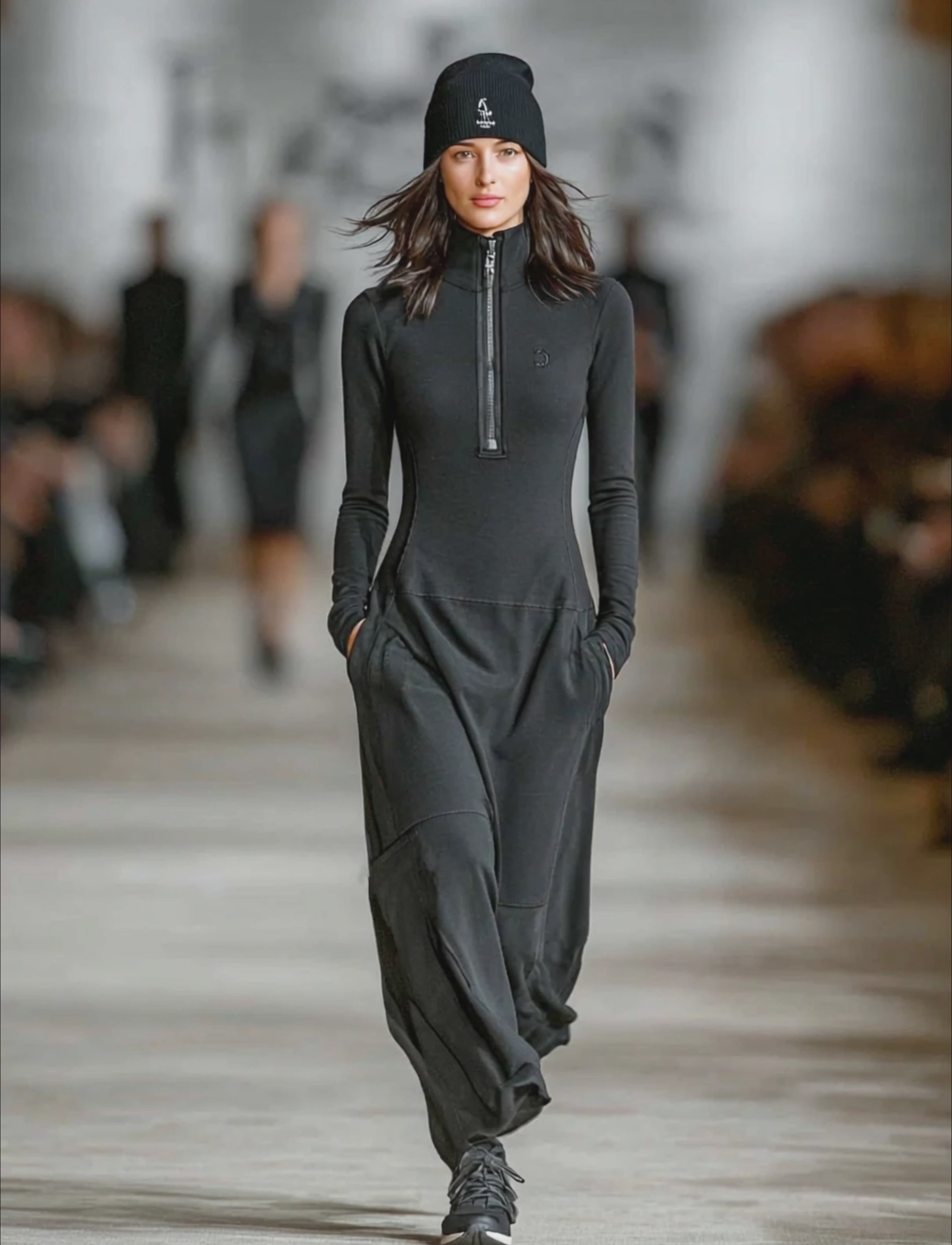 Women's Sports Cotton Blend Half-high Collar Zipper Loose Maxi Dress MDA3197G9Y