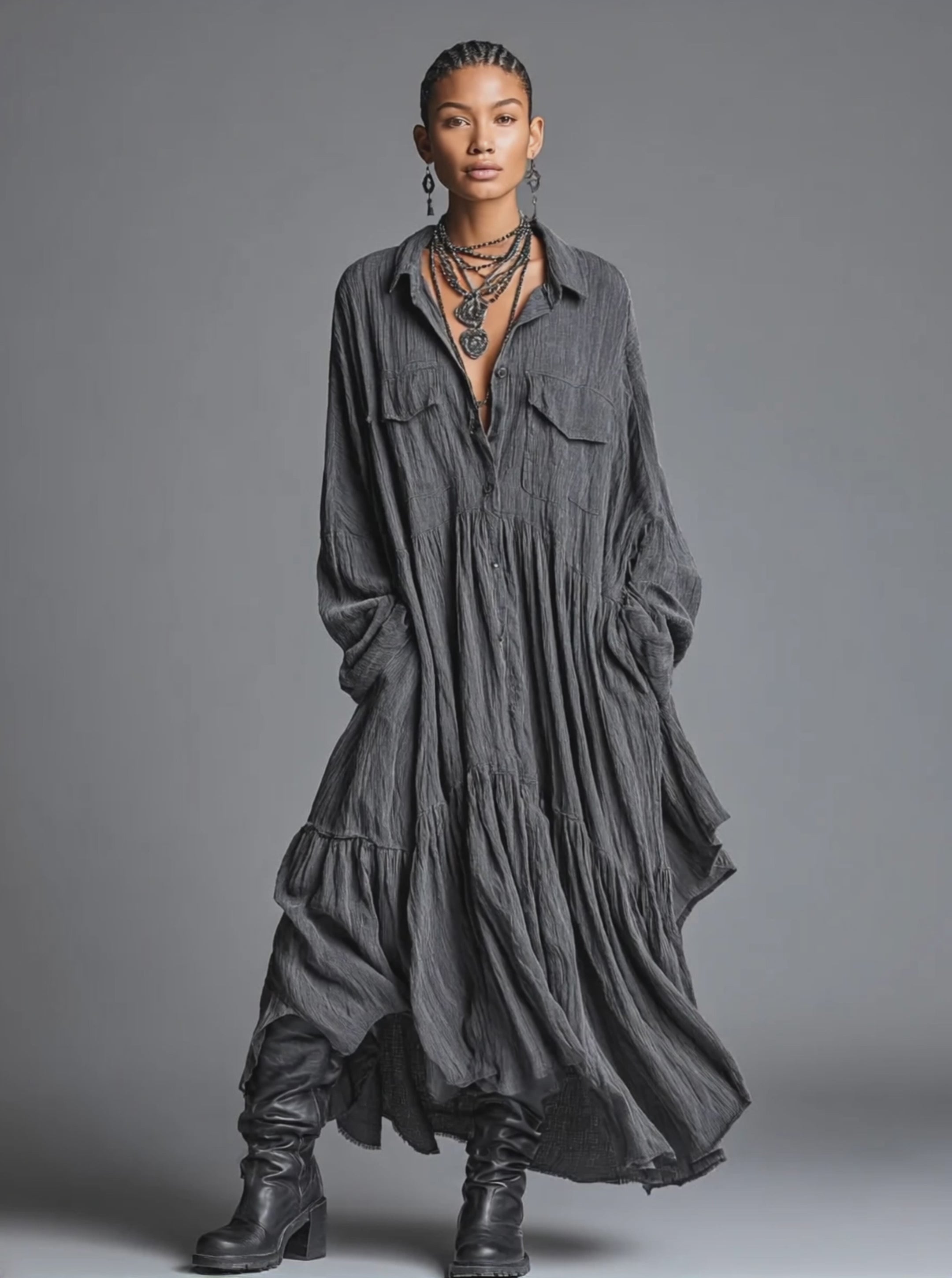 Women's Imitation Cotton And Linen Pleated Lapel Single-breasted Long-sleeved Maxi Dress MDA1968G0Y