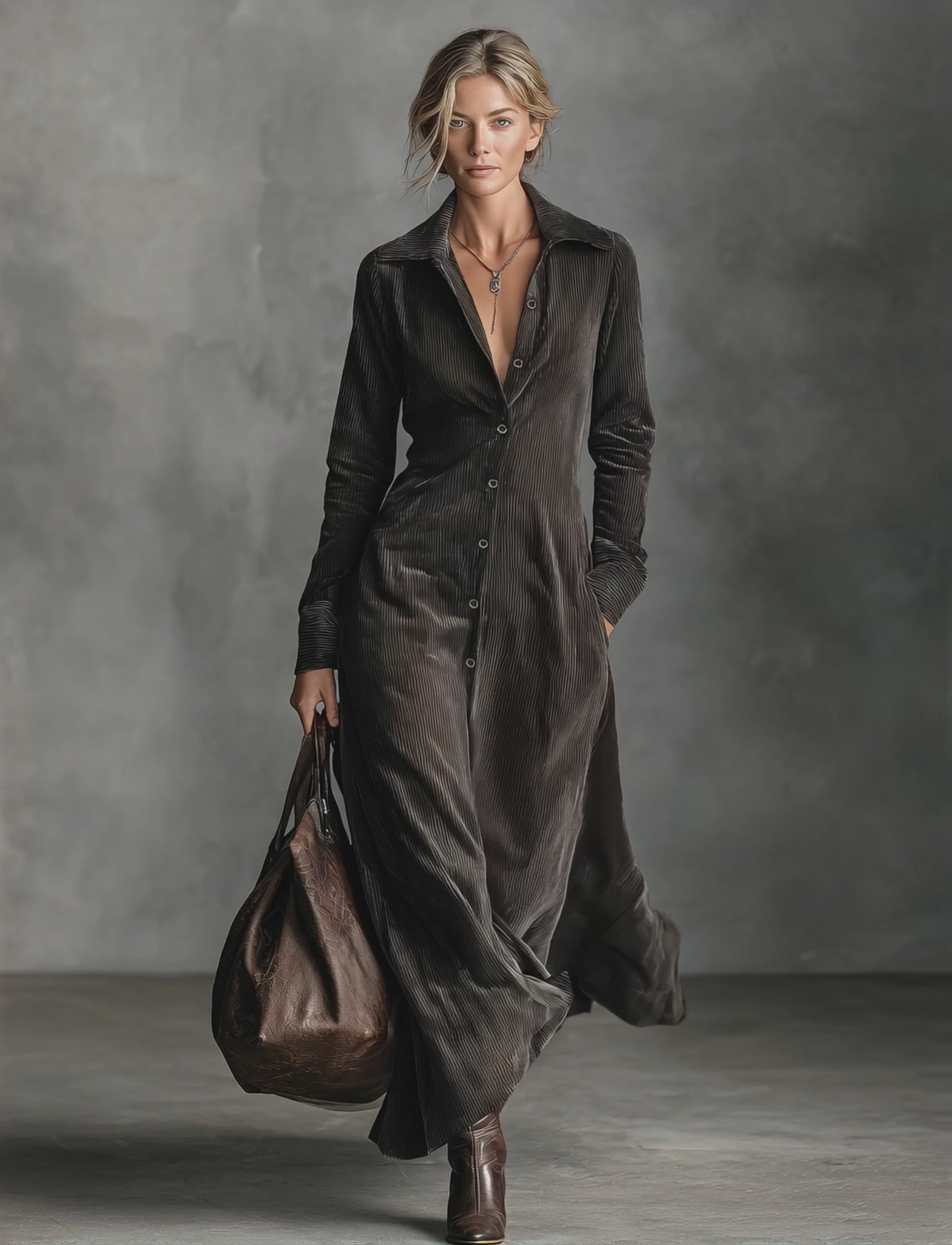 Women's Corduroy Single-breasted Lapel Maxi Dress