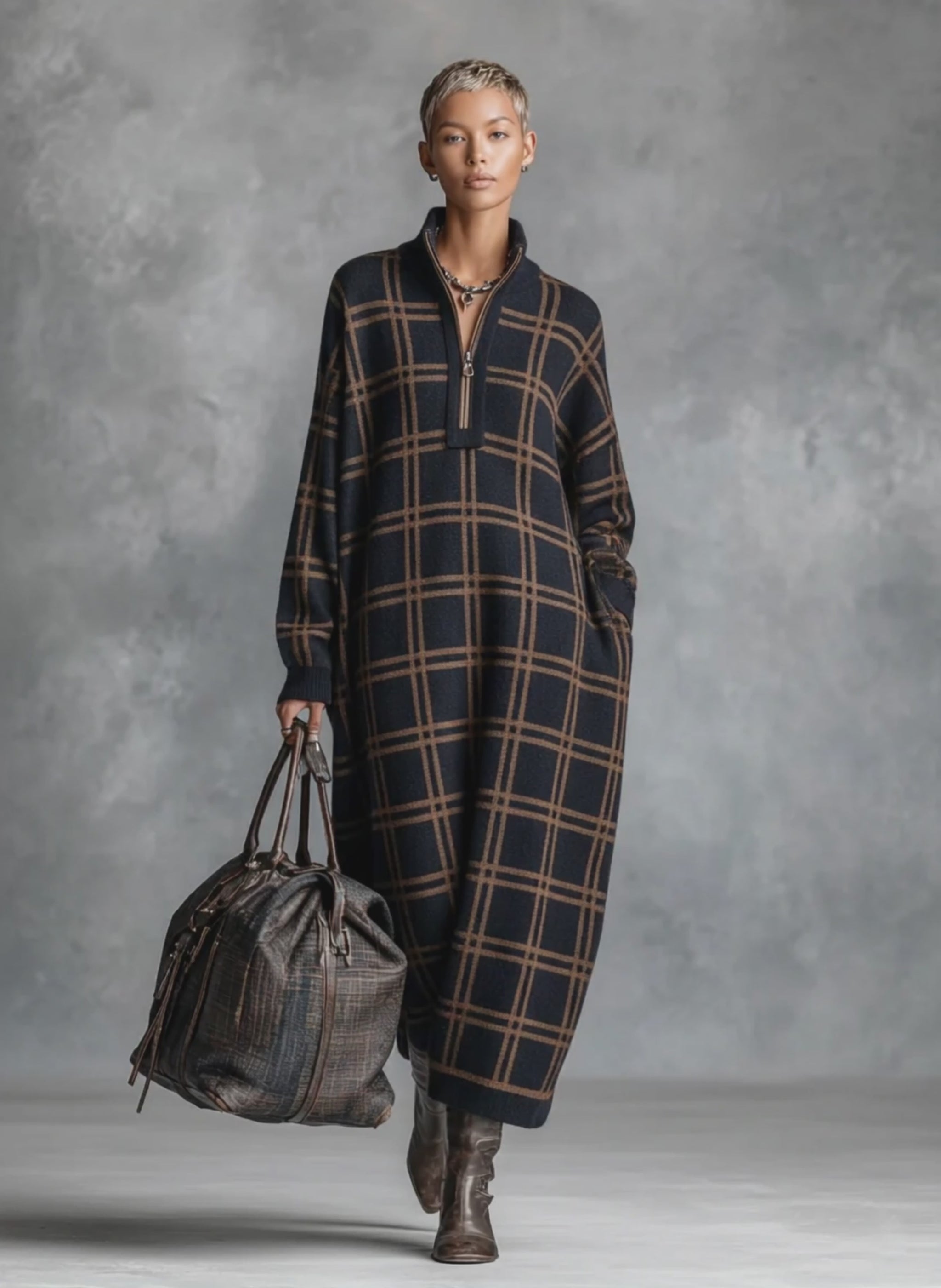 Women’s Loose Plaid Zipper Neck Knitted Maxi Dress
