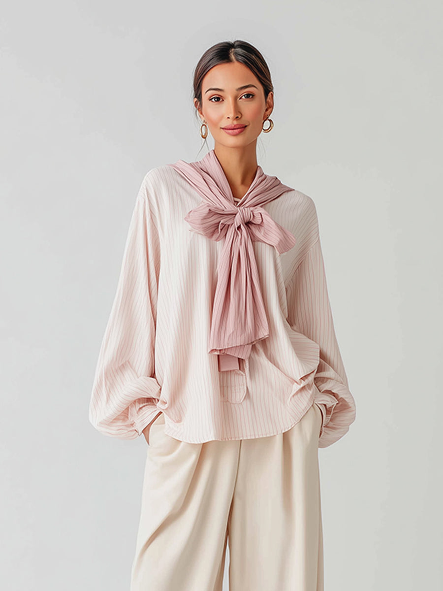 Women's Pink & Beige Textured Woven Co-Ord Set With Balloon-Sleeve Top & Flowy Pants, Minimalist Chic Style Set MDA0386K4I