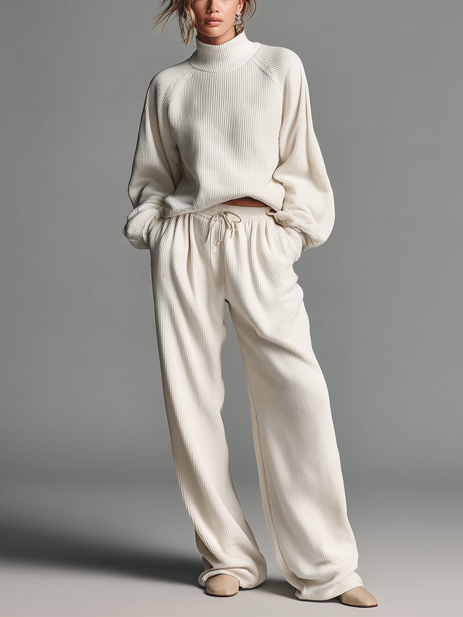 Women's Beige Turtleneck, Wide-leg Pants, And Minimalist Knitted Chic Suit MDA2446J0I