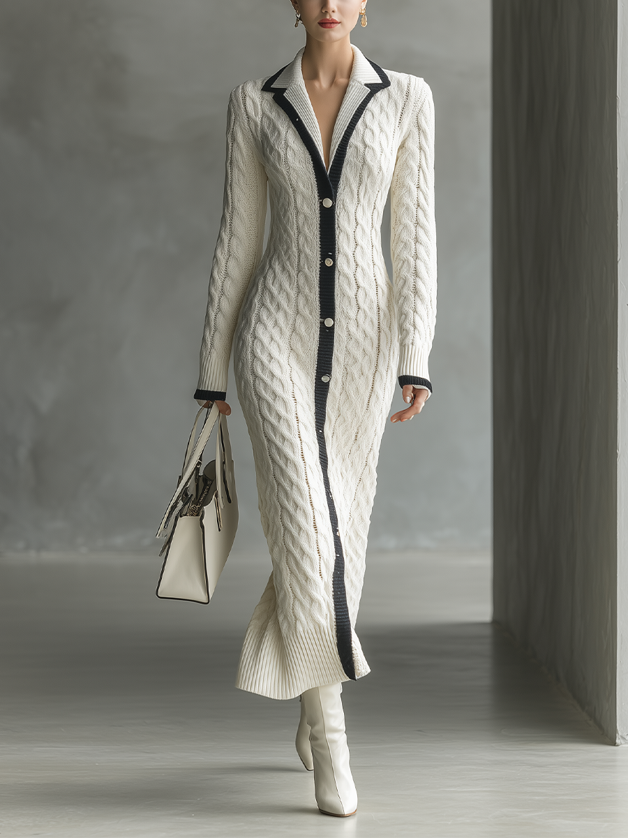 Women's Minimalist Black Trimmed Shawl Collar Cable Midi Dress (Belt Not Included) MDA2573J4Y