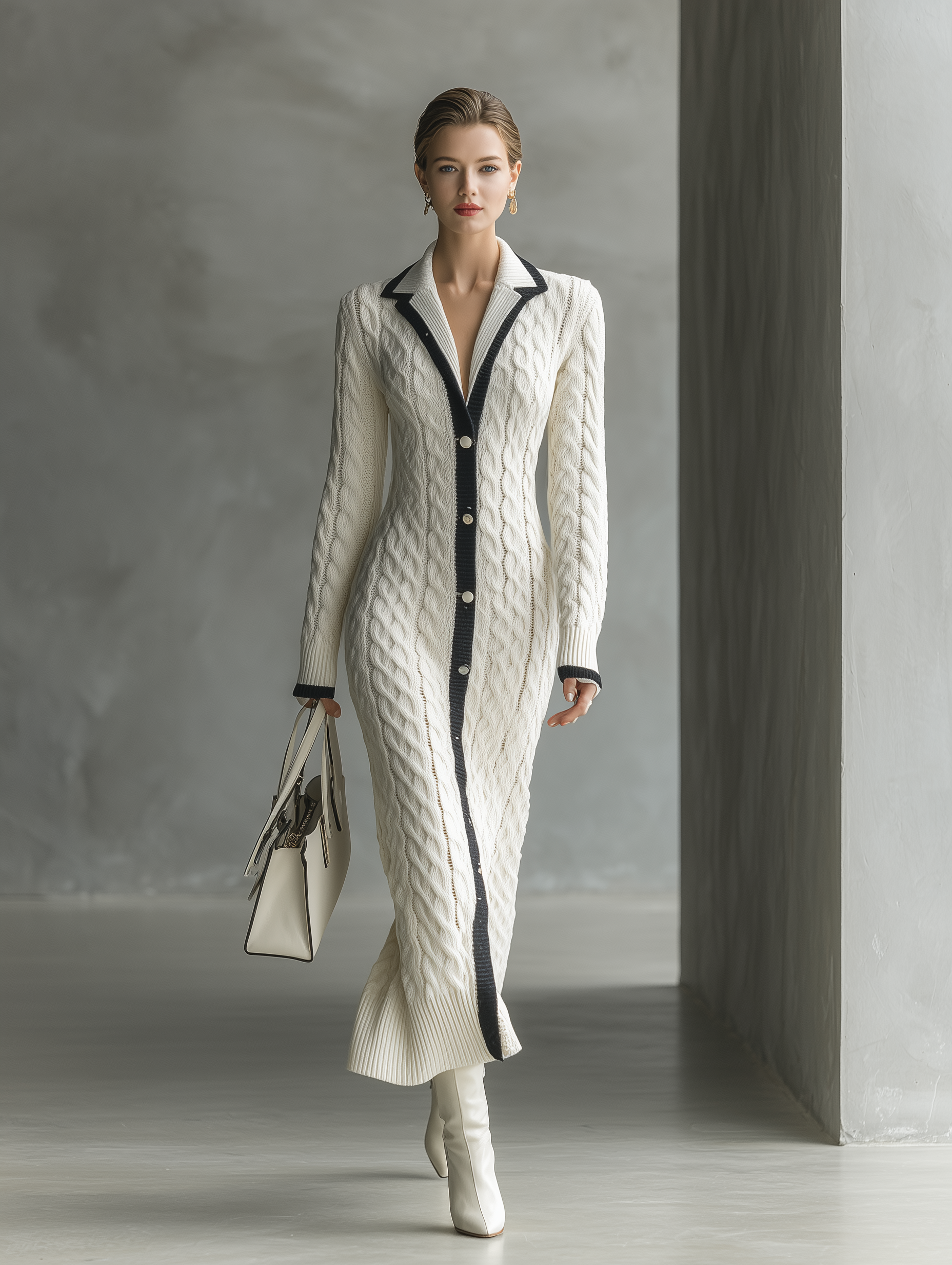 Women's White Cable Knit Straight-cut Black Color-blocked Cardigan MDA2814J2T
