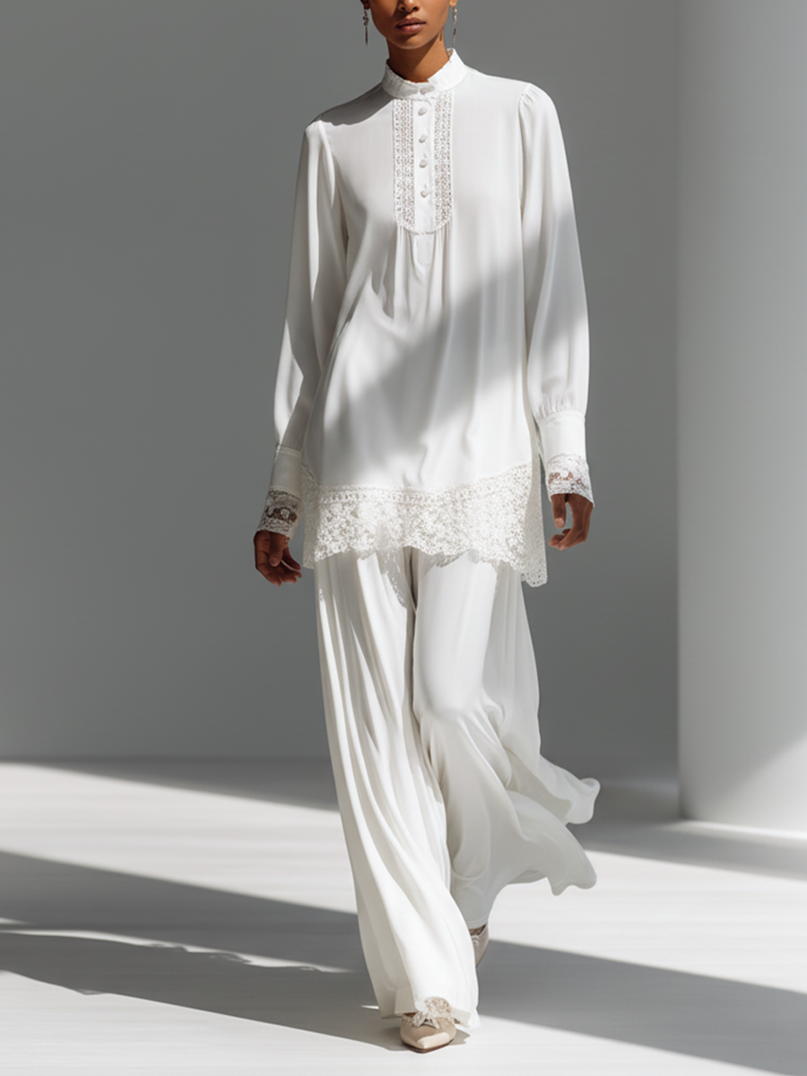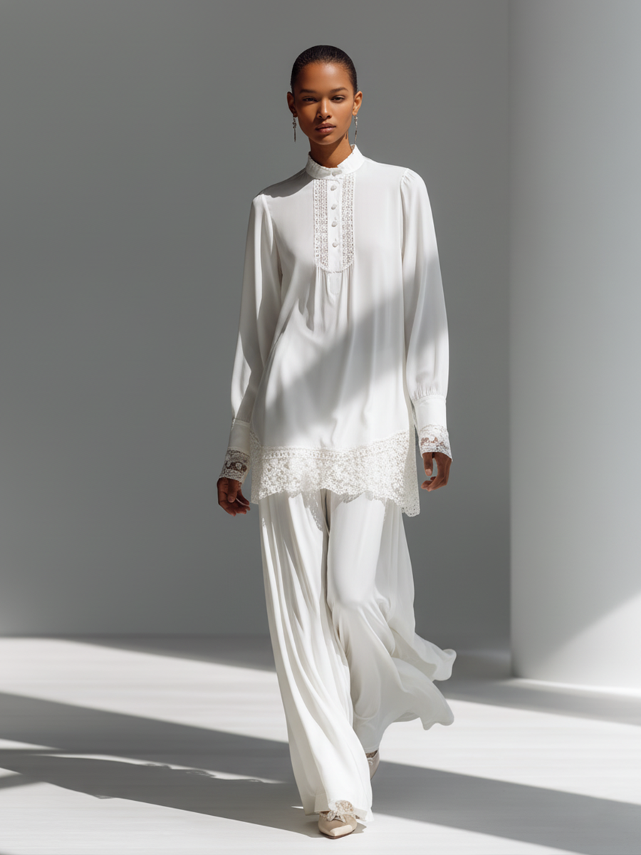 Women's White Satin Lace-Trimmed Top And Wide-Leg Pants Set MDA1752L3AP
