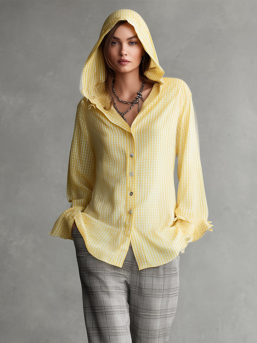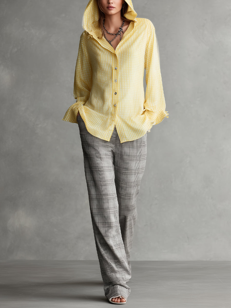 Women's Yellow Checked Linen-Blend Chic Hooded Shirt & Plaid Pant Set MDA0515K3I