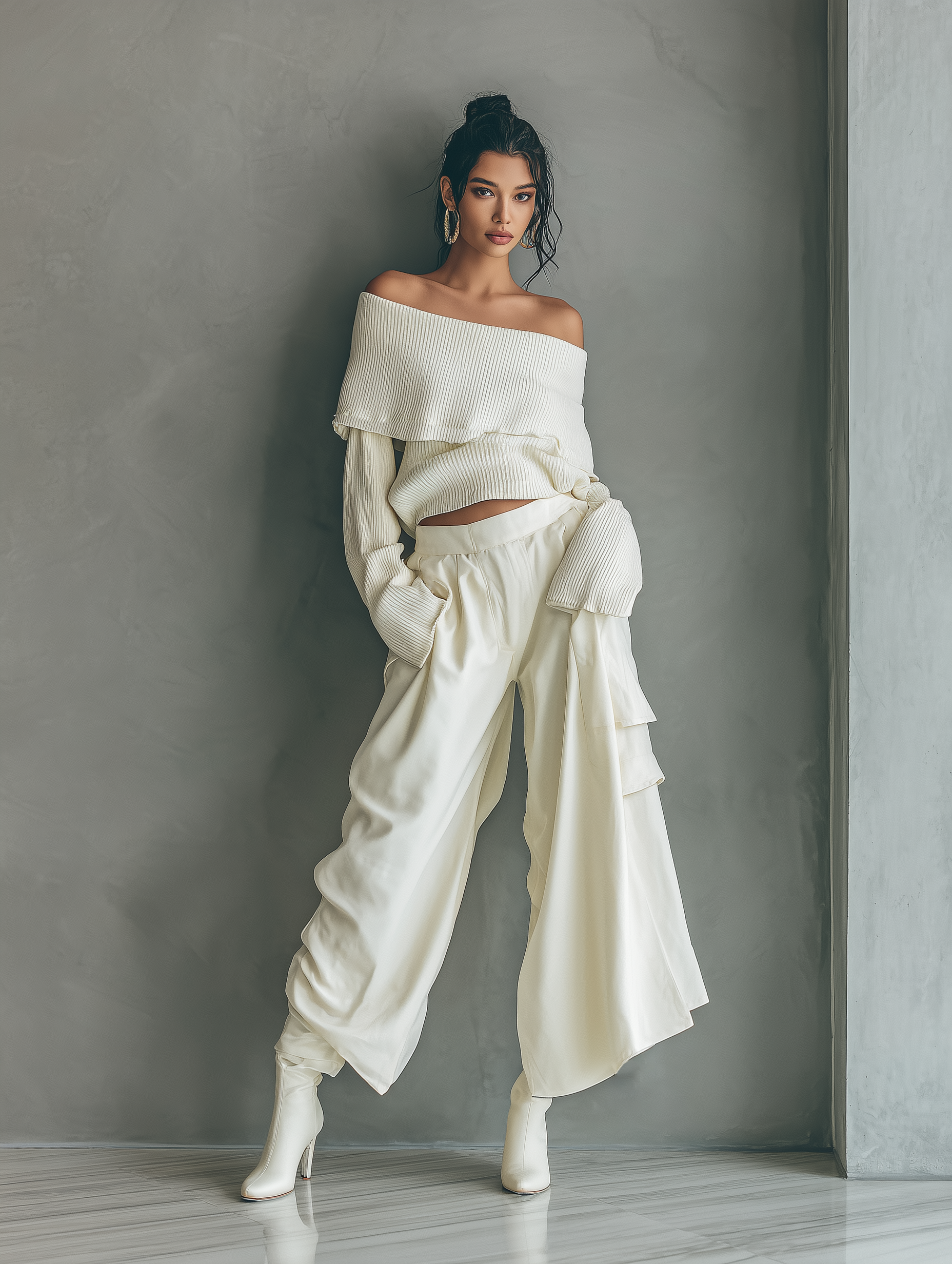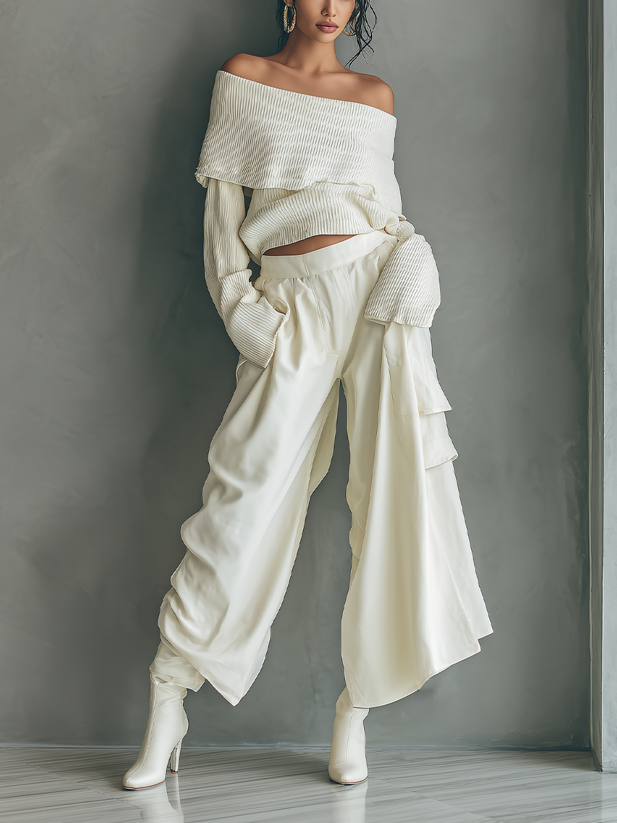 Women's Off-white Knit Top And Wide-leg Pants Set MDA0589K0T