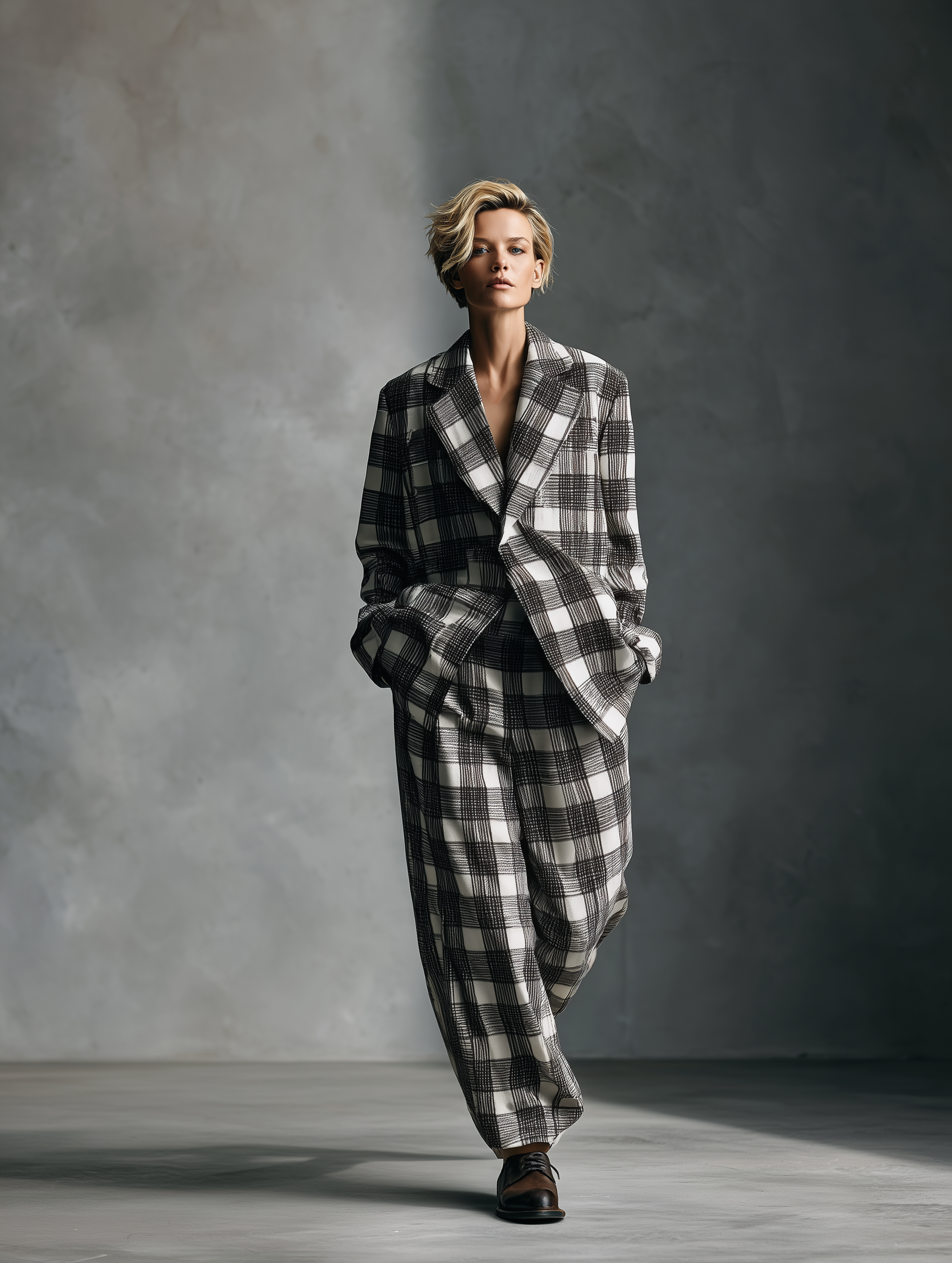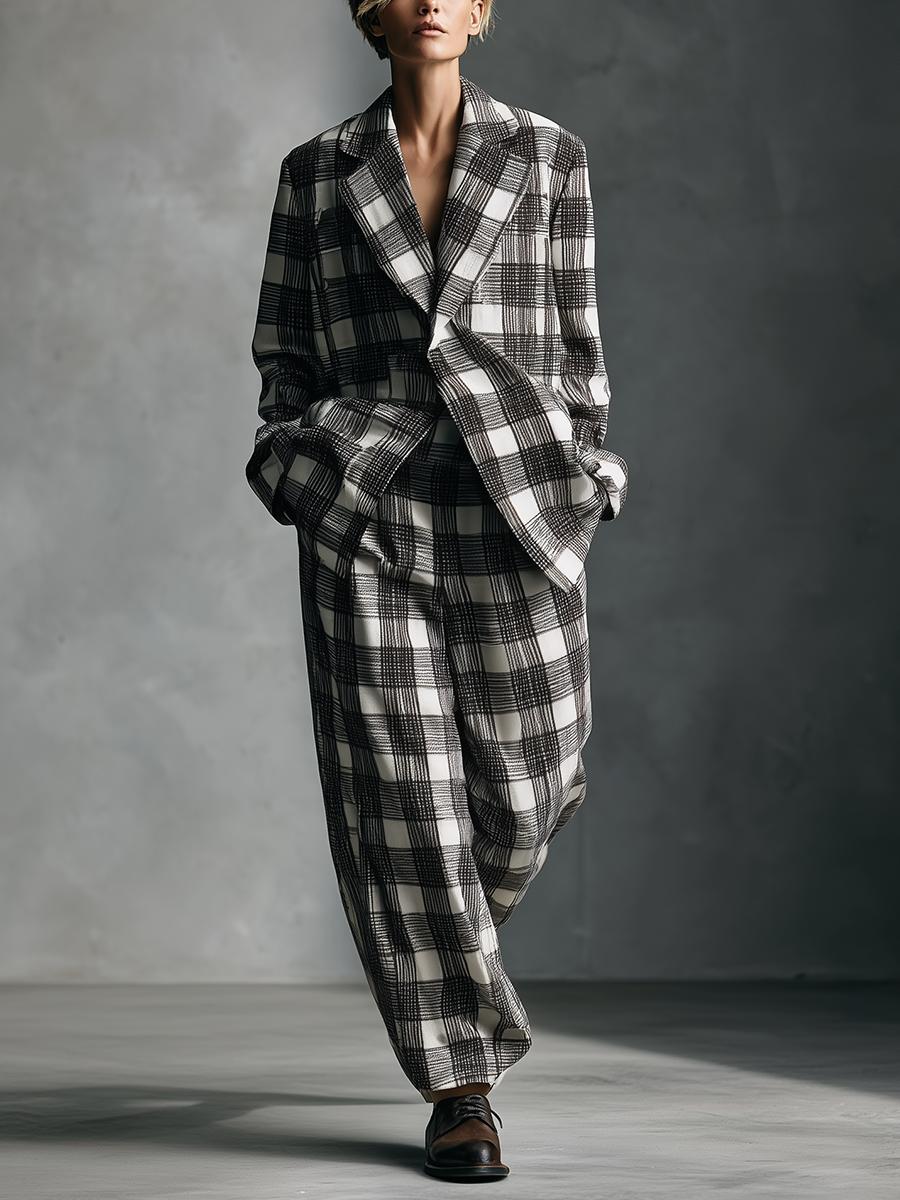 Women's Black And White Checkered Cotton Blend Casual Set MDA0578K4T