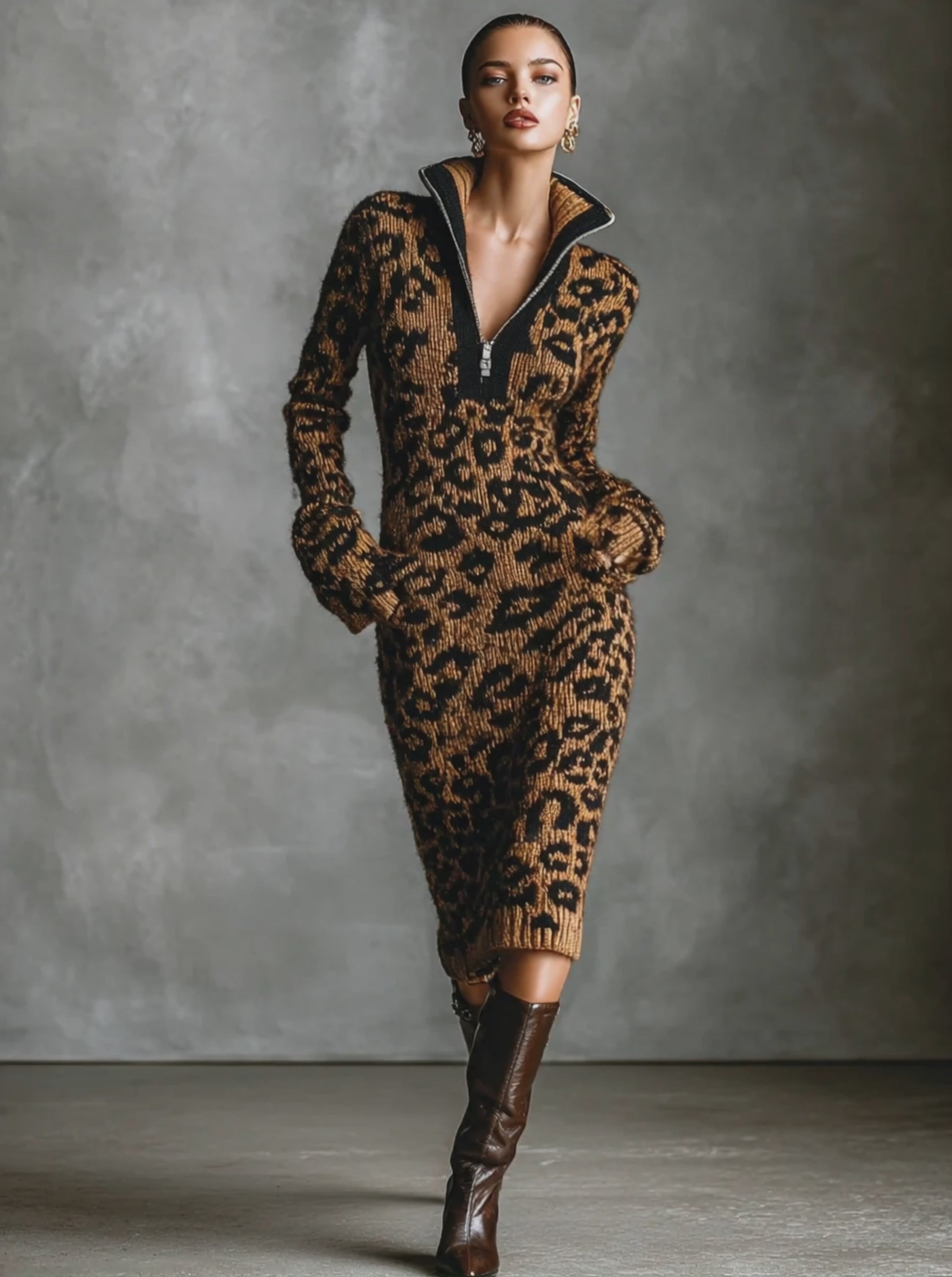 Women's Fashion Leopard Jacquard Knit Zipper Neck Midi Dress MDA2579H3Y
