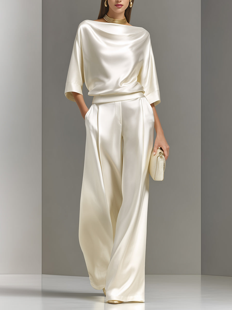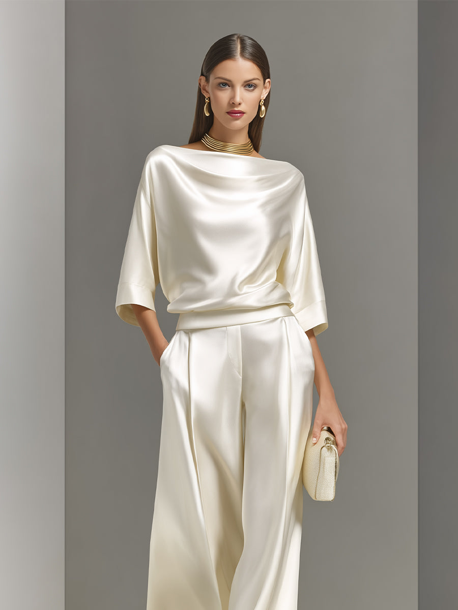 Women's Cream Luxe Woven Set With Half Sleeves & Relaxed Fit, Modern Elegant Style Set MDA0947L6I