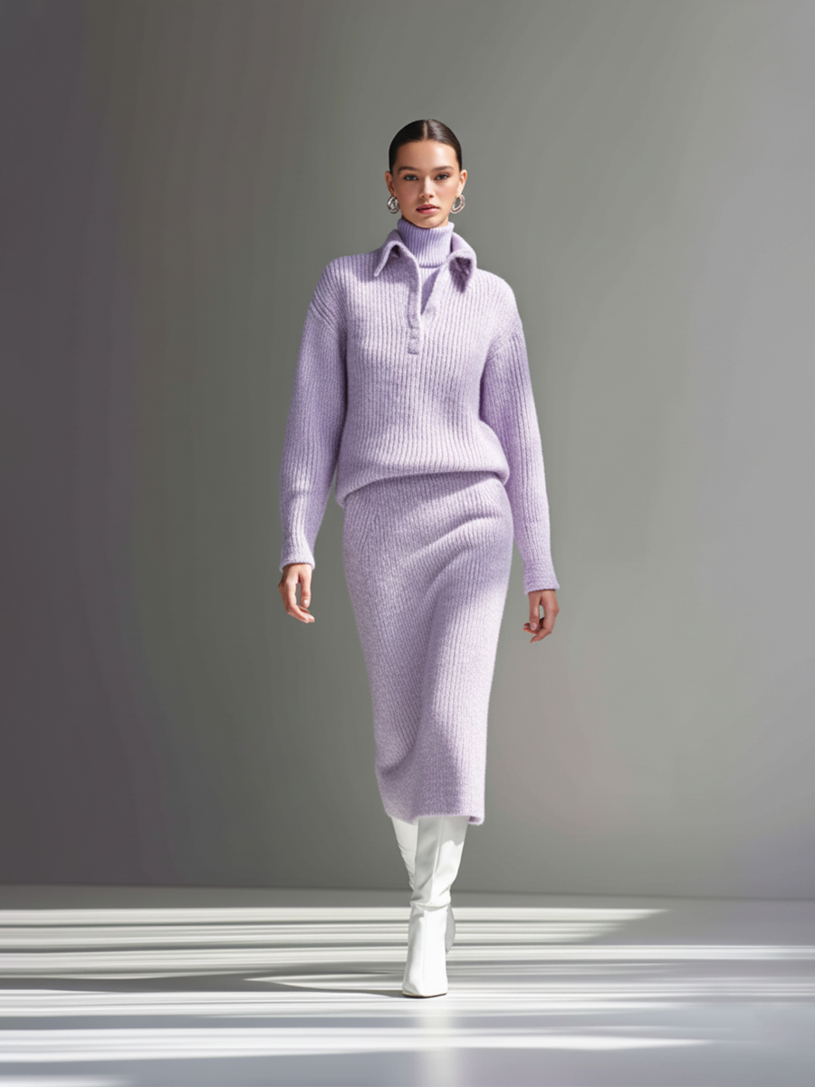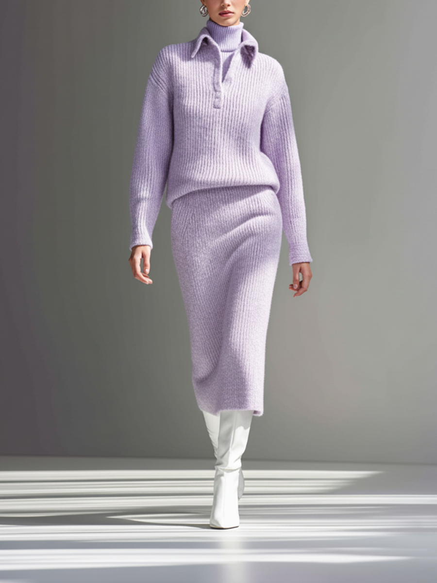 Women's Lavender Ribbed Knit Polo Shirt And Skirt Set MDA1516L8AP