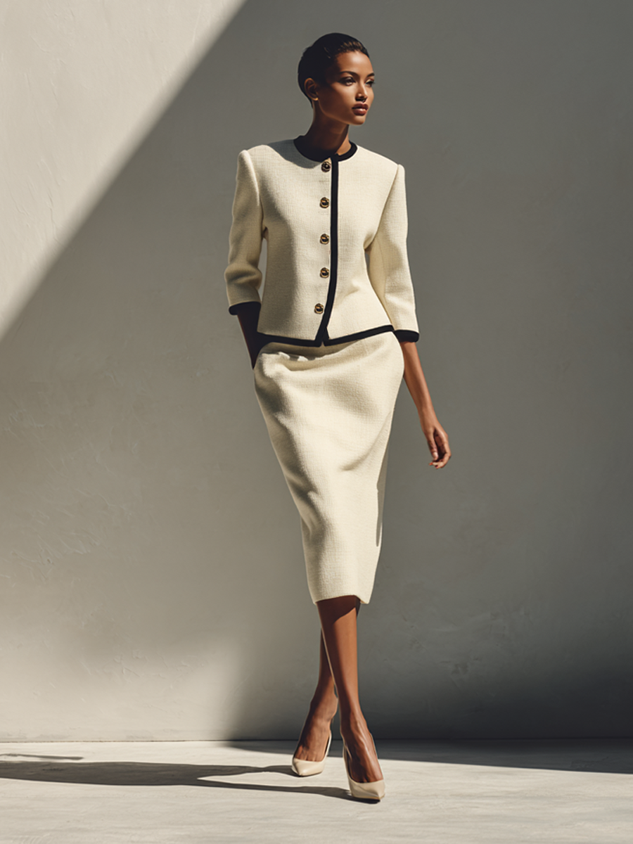 Women's Ivory And Black Contrast Tweed Jacket And Pencil Skirt Set MDA1735L3AP