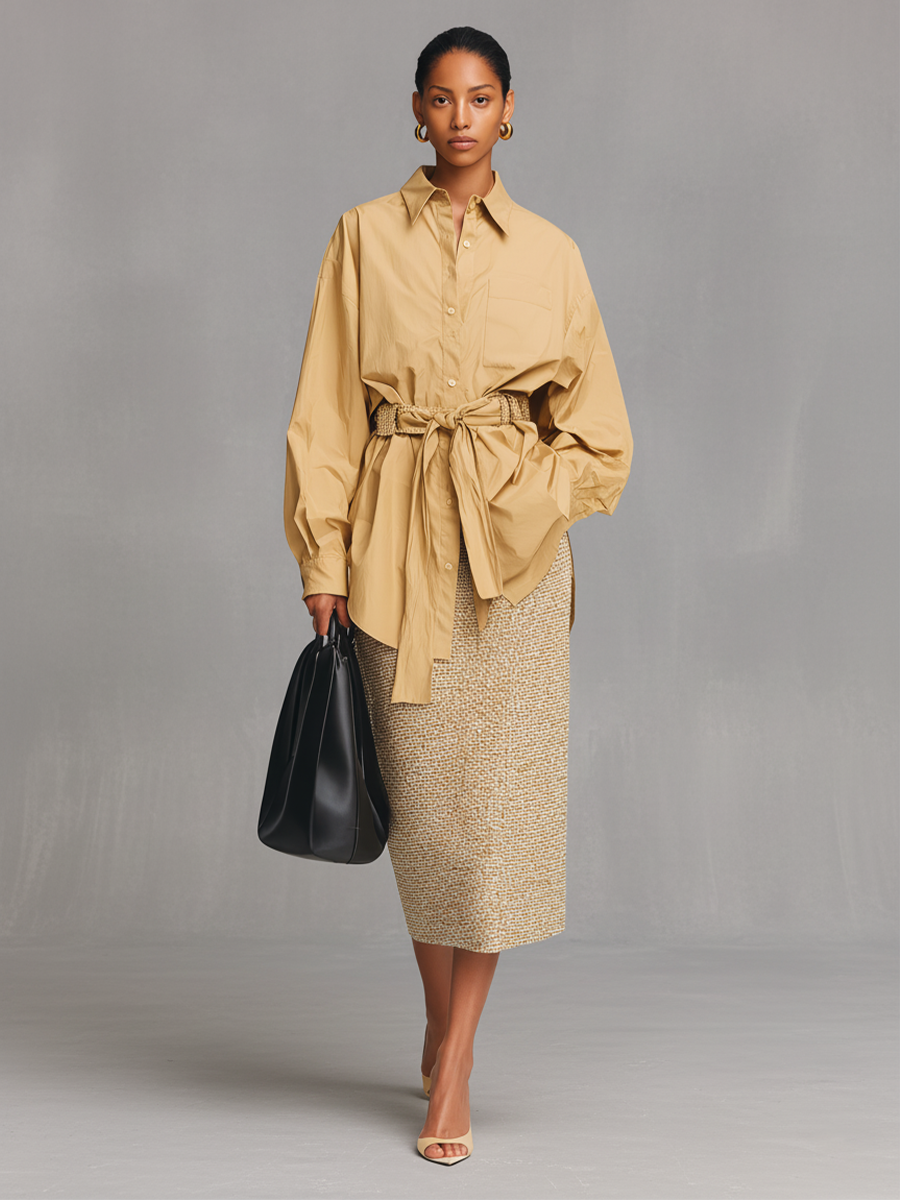 Women's Fashionable And Elegant Beige High-elastic Satin Shirt With Collar And Long Sleeves Paired With A Mid-length Skirt MDA1929K4AN