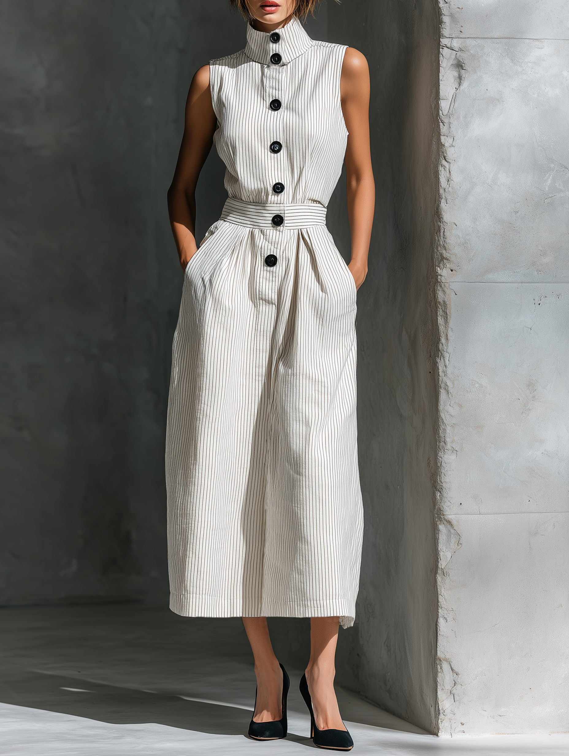 Women's Minimalist Striped Button-up Stand-collar Sleeveless Maxi Dress MDZ0531A6Y