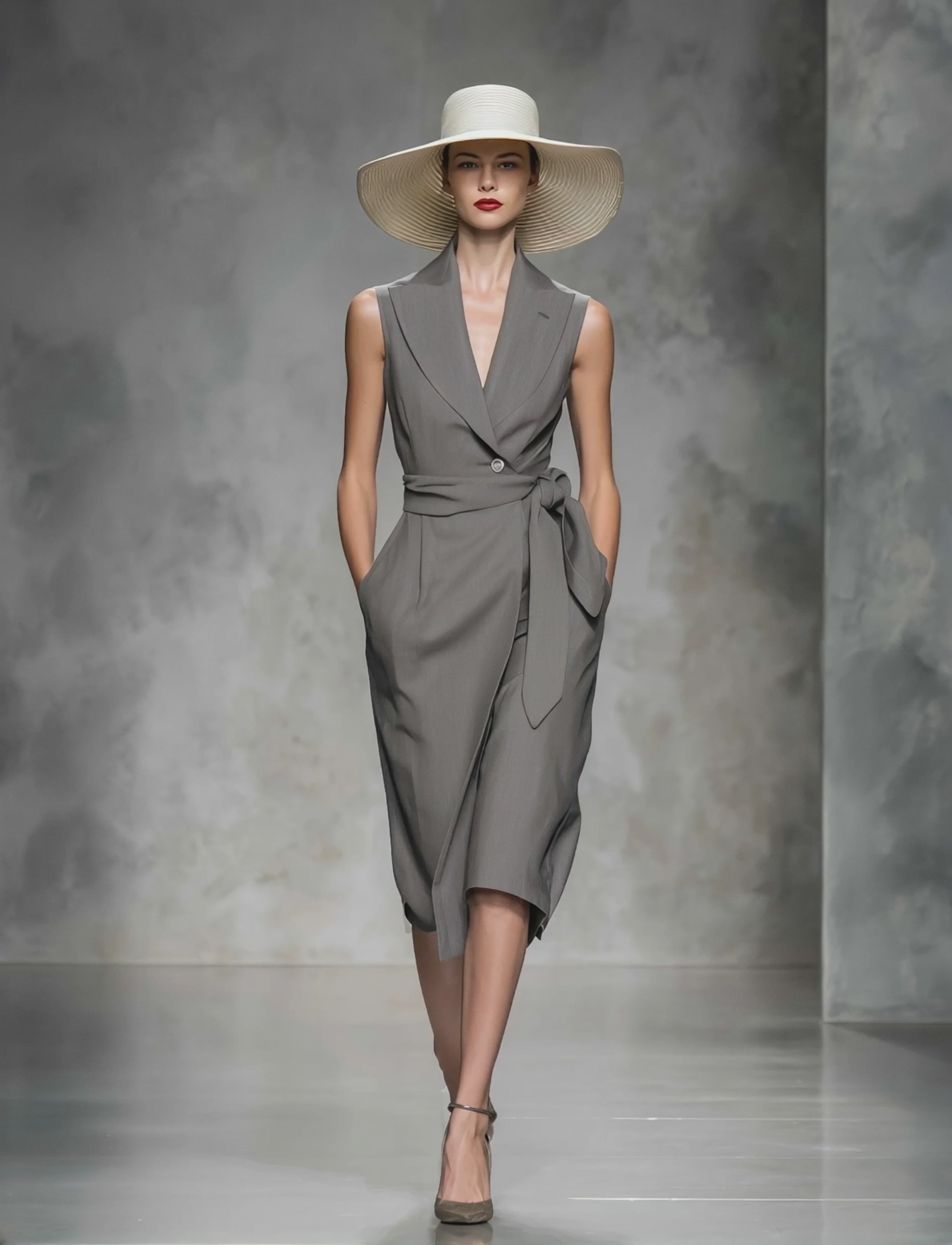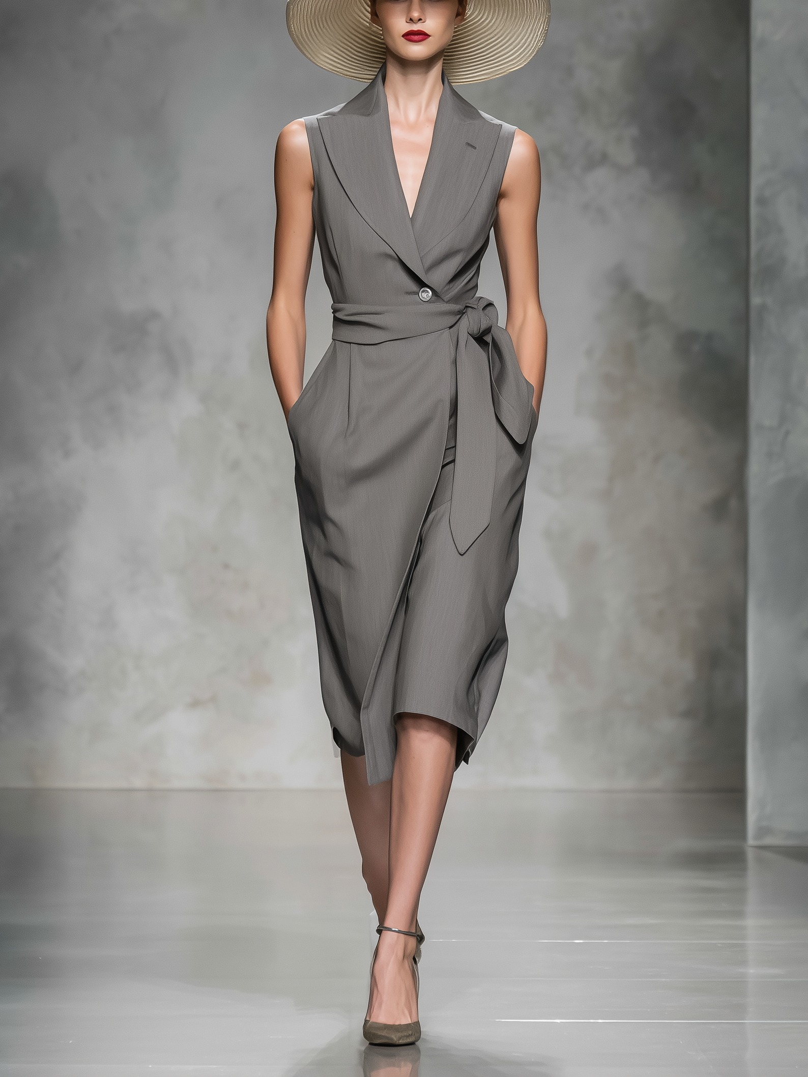 Women's Elegant Gray Sleeveless Collared Suit Dress With Belt MDA2941L2AN