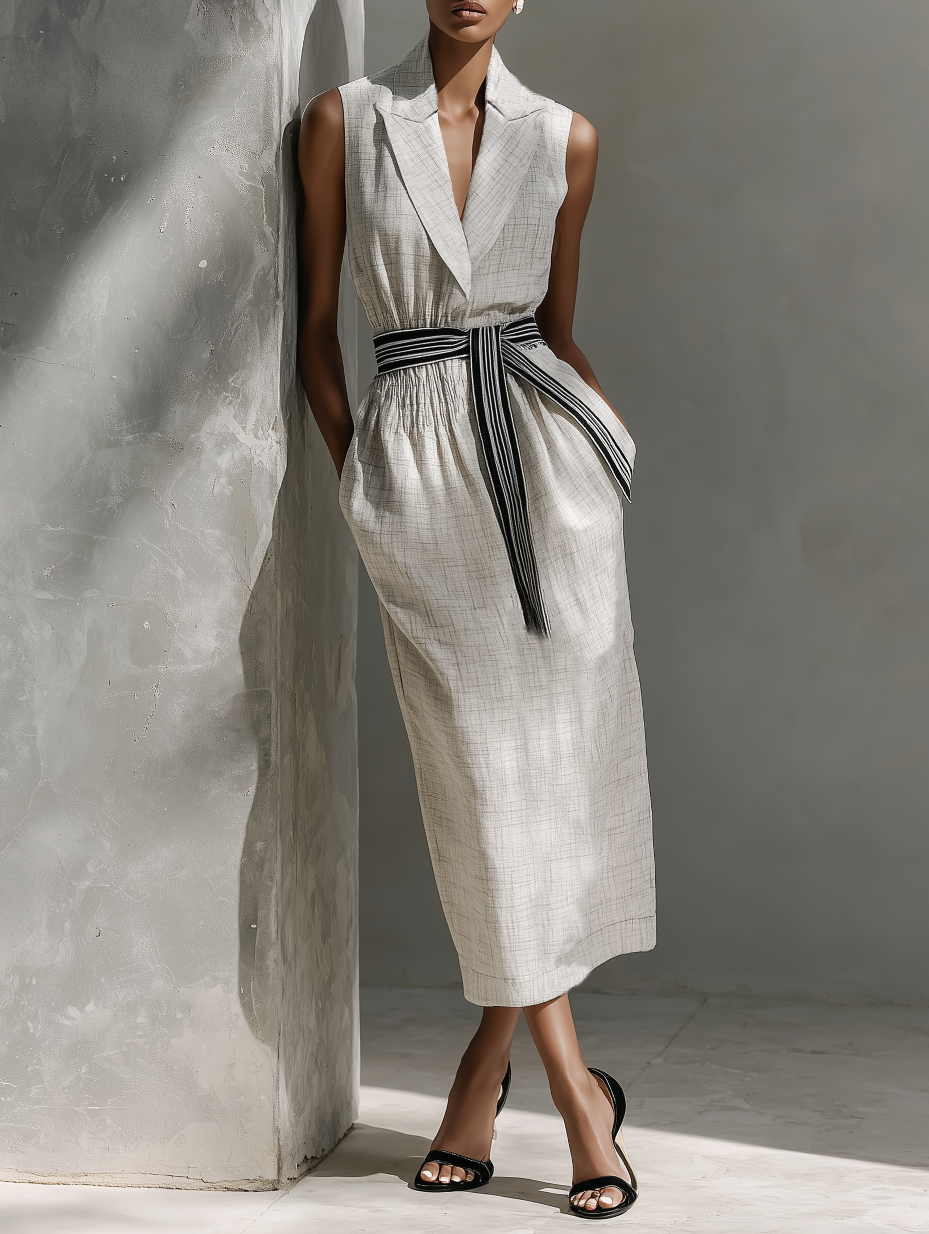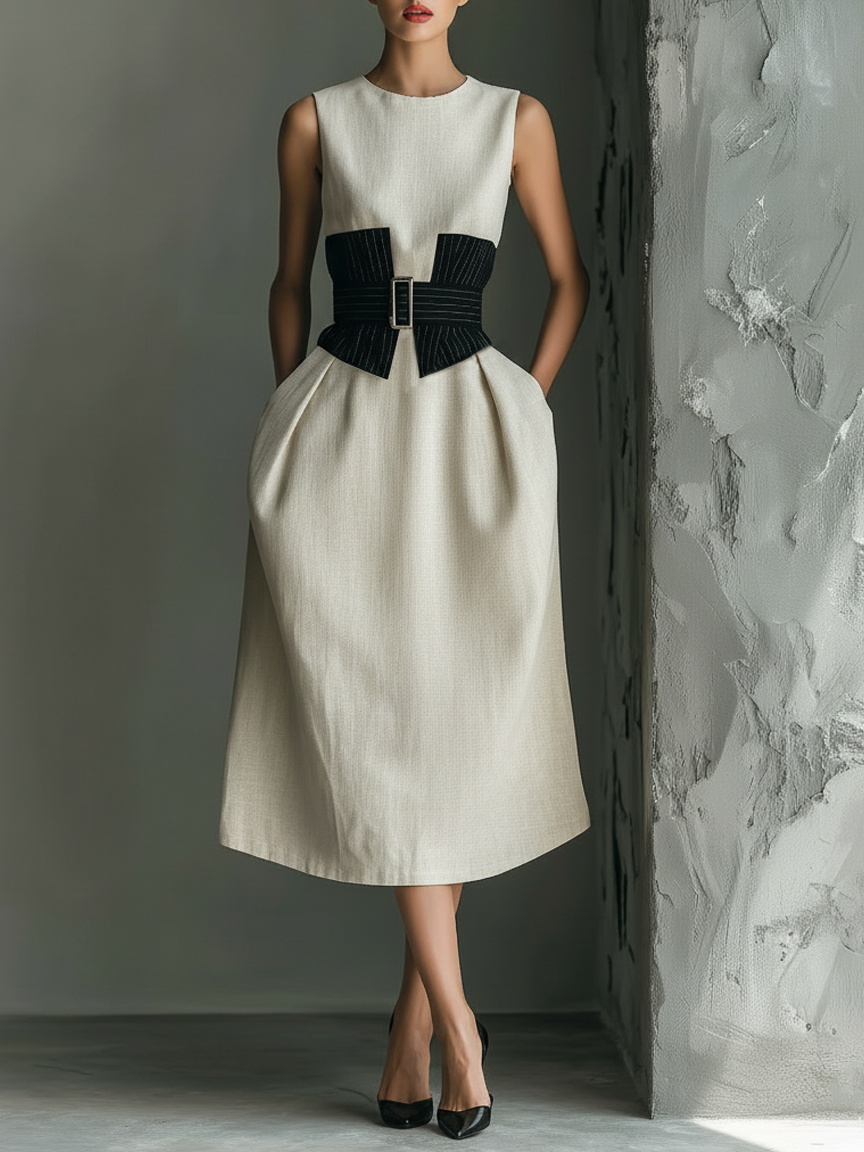 Women's Minimalist Patchwork Belted Sleeveless Midi Dress MDZ0504A0Y