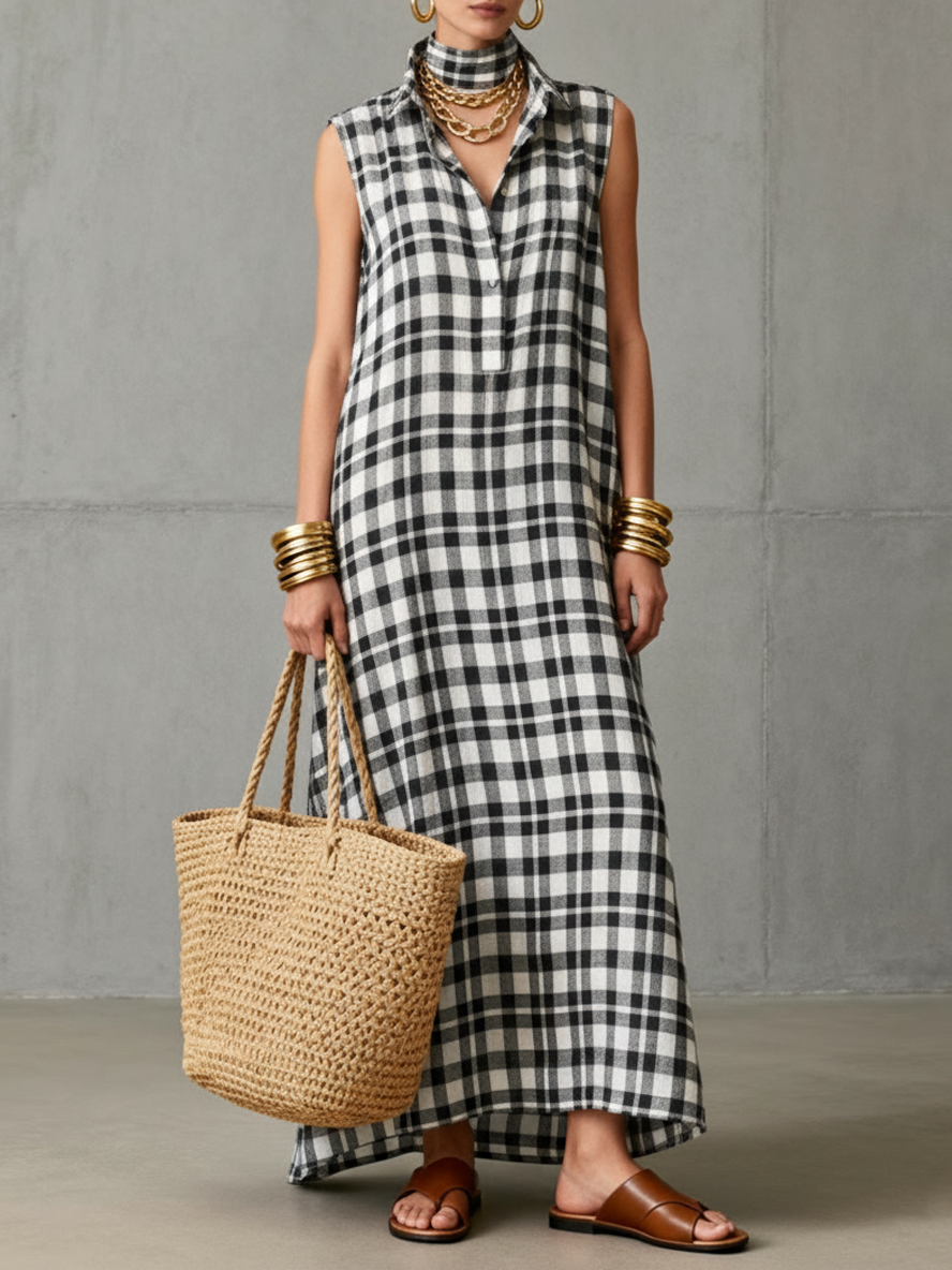 Women's Minimalist Checkered Sleeveless Maxi Dress MDZ0659A9Y